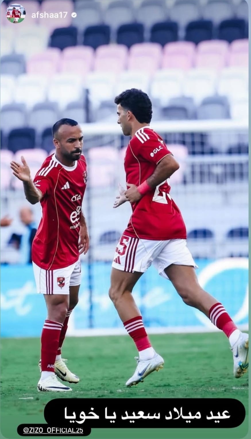 هنأ محمد مجدي قفشة نجم النادي الأهلي، زميله اللاعب أحمد سيد زيزو بعيد ميلاده بصورة تجمعهما سويًا قام بنشرها على حسابه الشخصي بموقع إنستجرام وعلق عليها قائلاً: “عيد ميلاد سعيد ياخويا".