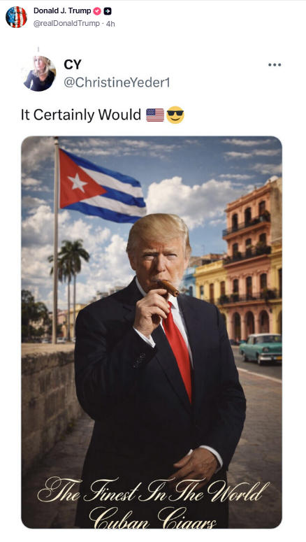 وكُتب على الصورة التي نشرها: "الأفضل في العالم السيجار الكوبي"، علما أن ترامب نفسه لا يدخن في الواقع.