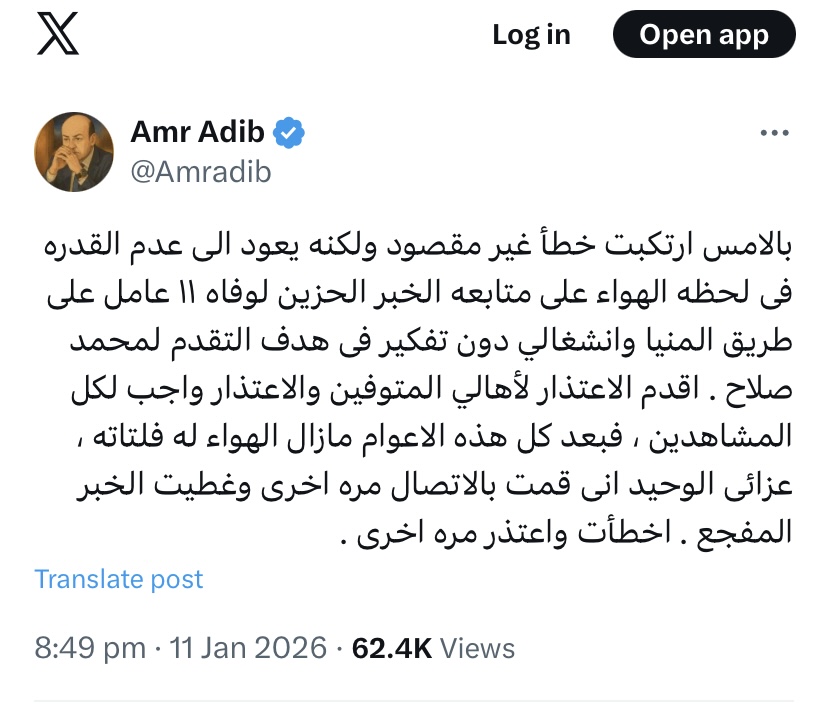 وكتب عمرو أديب عبر حسابه على موقع التواصل الاجتماعي «إكس»: «بالأمس ارتكبت خطأً غير مقصود، ولكنه يعود إلى عدم القدرة في لحظة الهواء على متابعة الخبر الحزين لوفاة 11 عاملًا على طريق المنيا، وانشغالي دون تفكير في هدف التقدم لمحمد صلاح.. أقدم الاعتذار لأهالي المتوفين».