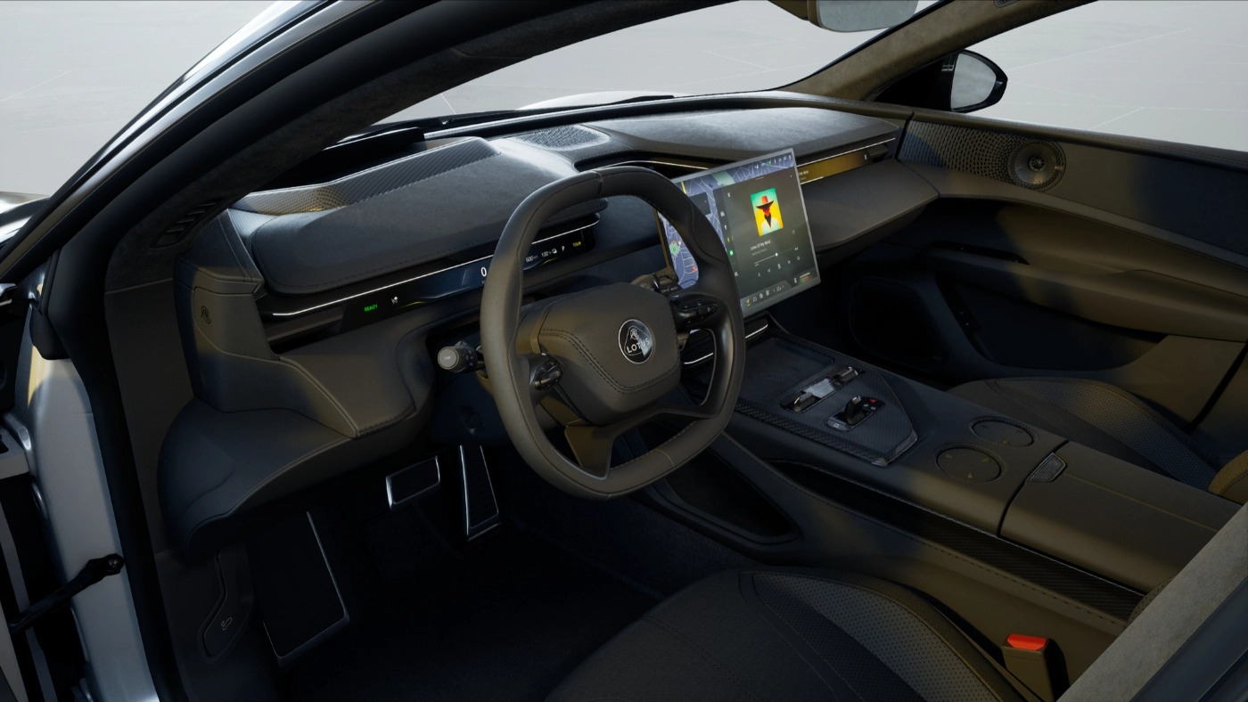 وتعتمد السيارة على نظام لوتس هايبر، الذي يدعم الاتصال اللاسلكي بالهواتف الذكية عبر آبل كاربلاي وأندرويد أوتو، وتضم المقصورة شاشة معلومات وترفيه مركزية قياس 15.1 بوصة بدقة عالية، إلى جانب شاشات نحيفة أمام السائق والراكب الأمامي، حيث تُعرض للراكب واجهة تشغيل الوسائط، كما توفر السيارة شاشة عرض على الزجاج الأمامي HUD تمتد حتى 55 بوصة.