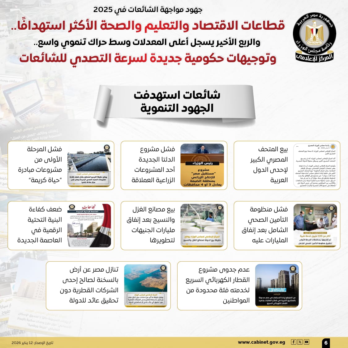 وأشارت الإنفوجرافات إلى إصدار رئيس مجلس الوزراء عددًا من التوجيهات في ديسمبر 2025، للتصدي للشائعات، أبرزها، سرعة إعداد وإصدار القانون الخاص بتنظيم تداول البيانات والمعلومات الرسمية، كما وجه بتفعيل دور المكاتب الإعلامية بالوزارات للتصدي للشائعات، إلى جانب التوجيه بإطلاق المنصة الرقمية للمركز الإعلامي لمجلس الوزراء للتحقق من صحة الأخبار المنشورة بشكل سريع.