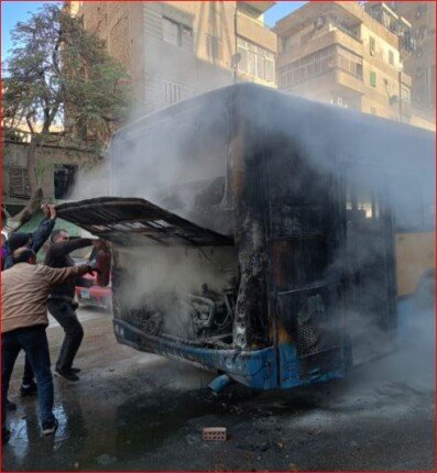 واشارت التحريات انه أثناء سير أتوبيس نقل عام قيادة سائق، 50 سنة، حدث اشتعال بالجزء الخلفي بسبب ماس كهربائي فتوقف على جانب الطريق لإنزال الركاب، وحصل تدافع بينهم نتج عنه إصابة ربة منزل باختناق، وإصابة مهندس بجروح باليد بسبب كسر النوافذ وقفزه منها.