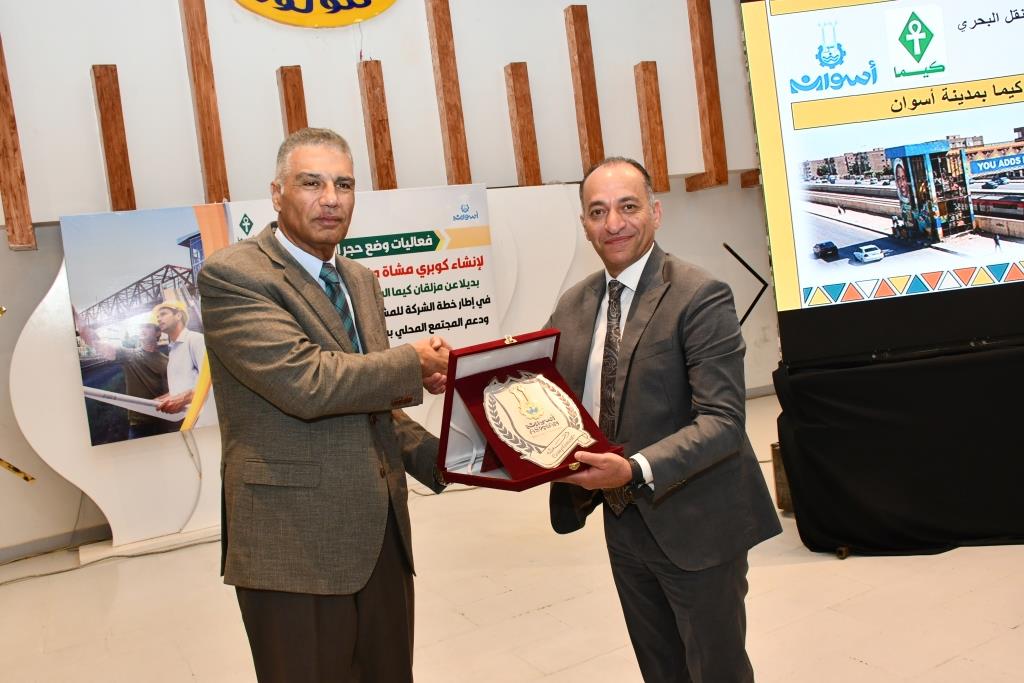 وأكد على أن هذه المشروعات ستسهم فى خدمة أهالي مناطق كيما ، وعزب كيما ، والسيل الجديد ، والسيل الريفى ، والشيخ هارون ، وتحقيق الربط الآمن بين شرق وغرب السكة الحديد بما يحافظ على أرواح وسلامة المواطنين ، خاصة الأطفال وكبار السن ، وفى نهاية الفعاليات تم تبادل الدروع بين محافظ أسوان ورئيس شركة كيما تقديراً للتعاون المتبادل بين الجانبين .