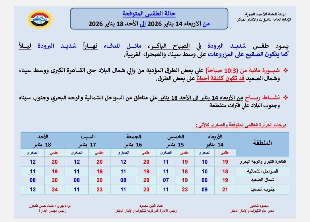 تشير أحدث توقعات الهيئة العامة للأرصاد الجوية إلى أن البلاد ستشهد غدًا الثلاثاء الموافق 13 يناير 2026 استمرارًا في انخفاض درجات الحرارة على أغلب أنحاء الجمهورية، في ظل أجواء شتوية قاسية يسودها طقس شديد البرودة خلال ساعات الصباح الباكر، ومائل للبرودة نهارًا، قبل أن تعود الأجواء شديدة البرودة ليلًا، مع استمرار فرص تكون الصقيع على المزروعات في شمال الصعيد ووسط سيناء والصحراء الغربية.