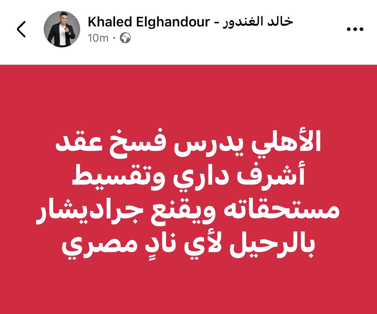 وكتب الغندور على حسابه الشخصي بموقع فيسبوك: “الأهلي يدرس فسخ عقد أشرف داري وتقسيط مستحقاته ويقنع جراديشار بالرحيل لأي نادٍ مصري”.
