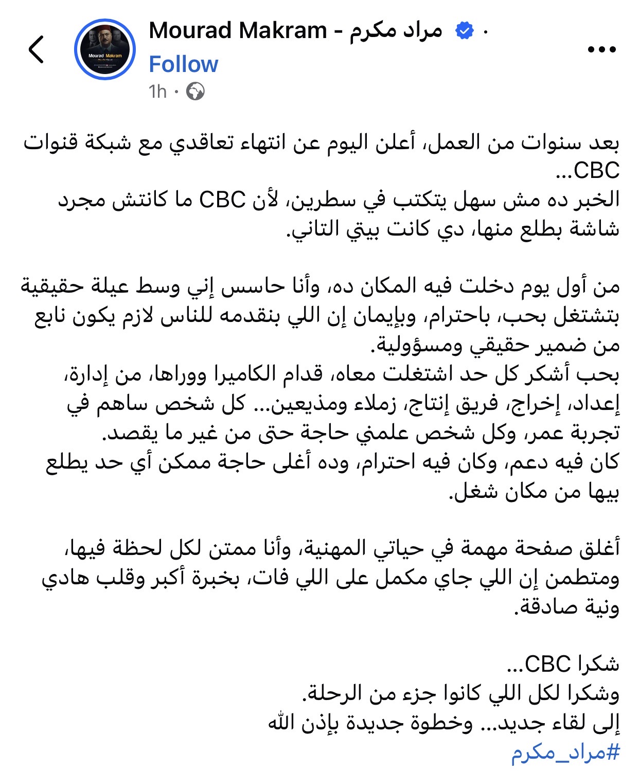 وقال مراد مكرم في منشوره إن قرار الرحيل لم يكن سهلًا، مؤكدًا أن شبكة CBC لم تكن مجرد جهة عمل، بل مثّلت له “البيت الثاني”، لما وجده داخلها من دعم واحترام وروح عائلية بين جميع العاملين.