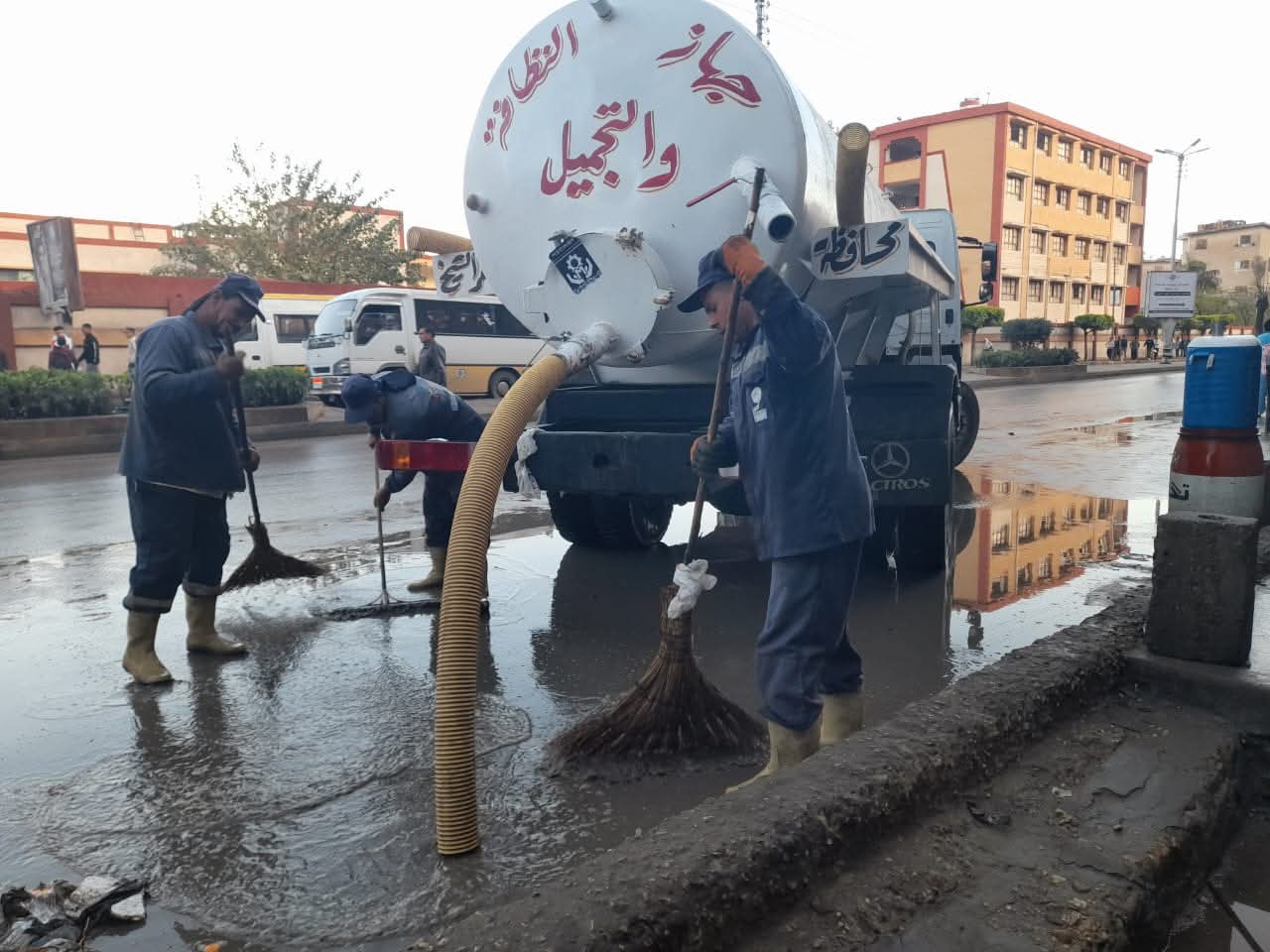 وانتشرت فرق العمل التابعة لجهاز النظافة والتجميل، مدعومة بسيارات الكسح، لشفط تراكمات المياه وفتح صفايات الأمطار وتطهيرها لضمان السيولة المرورية، بالتزامن مع استمرار أعمال رفع المخلفات والقمامة اليومية.