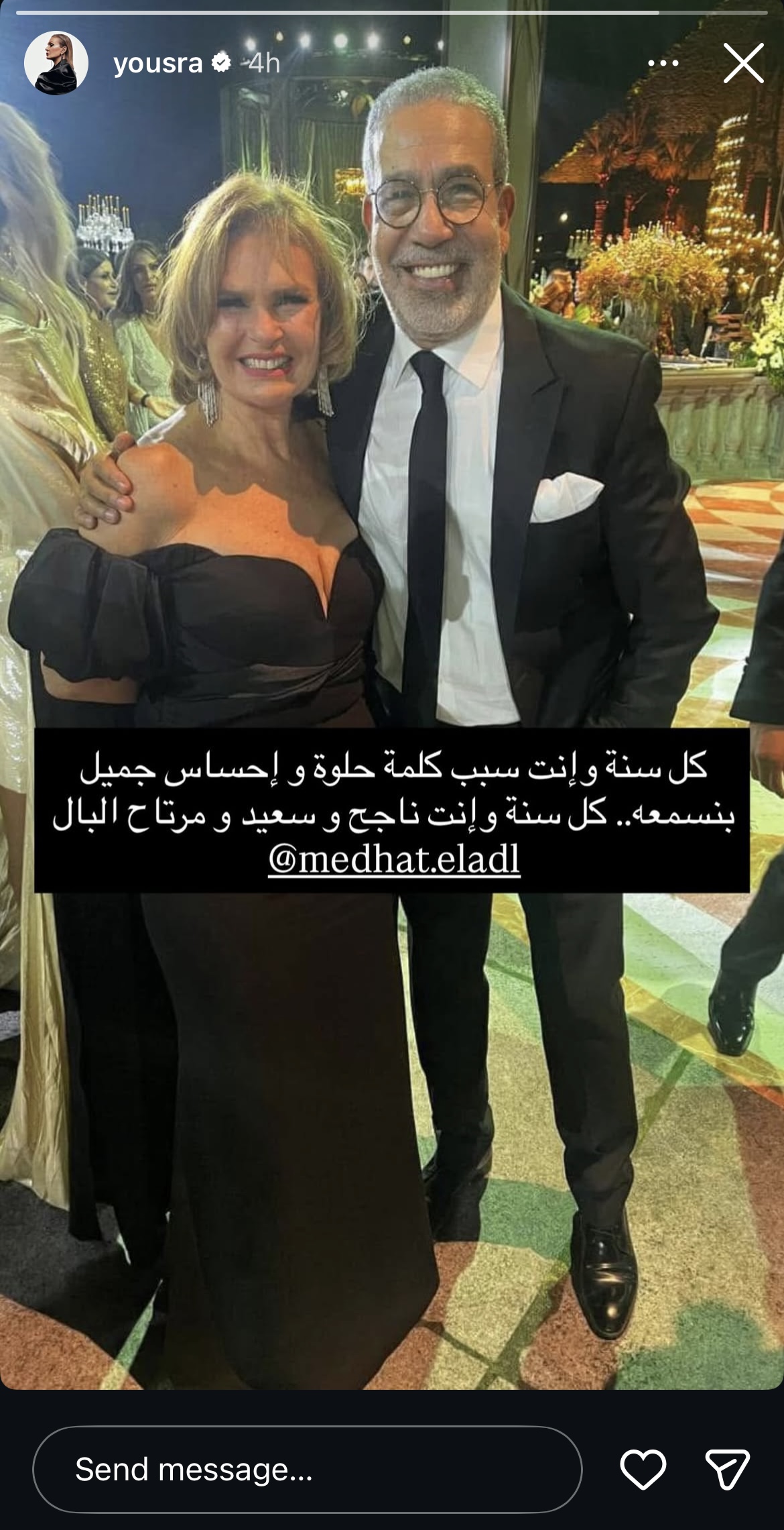 هنّأت الفنانة يسرا، الكاتب والمنتج مدحت العدل، بمناسبة عيد ميلاده.