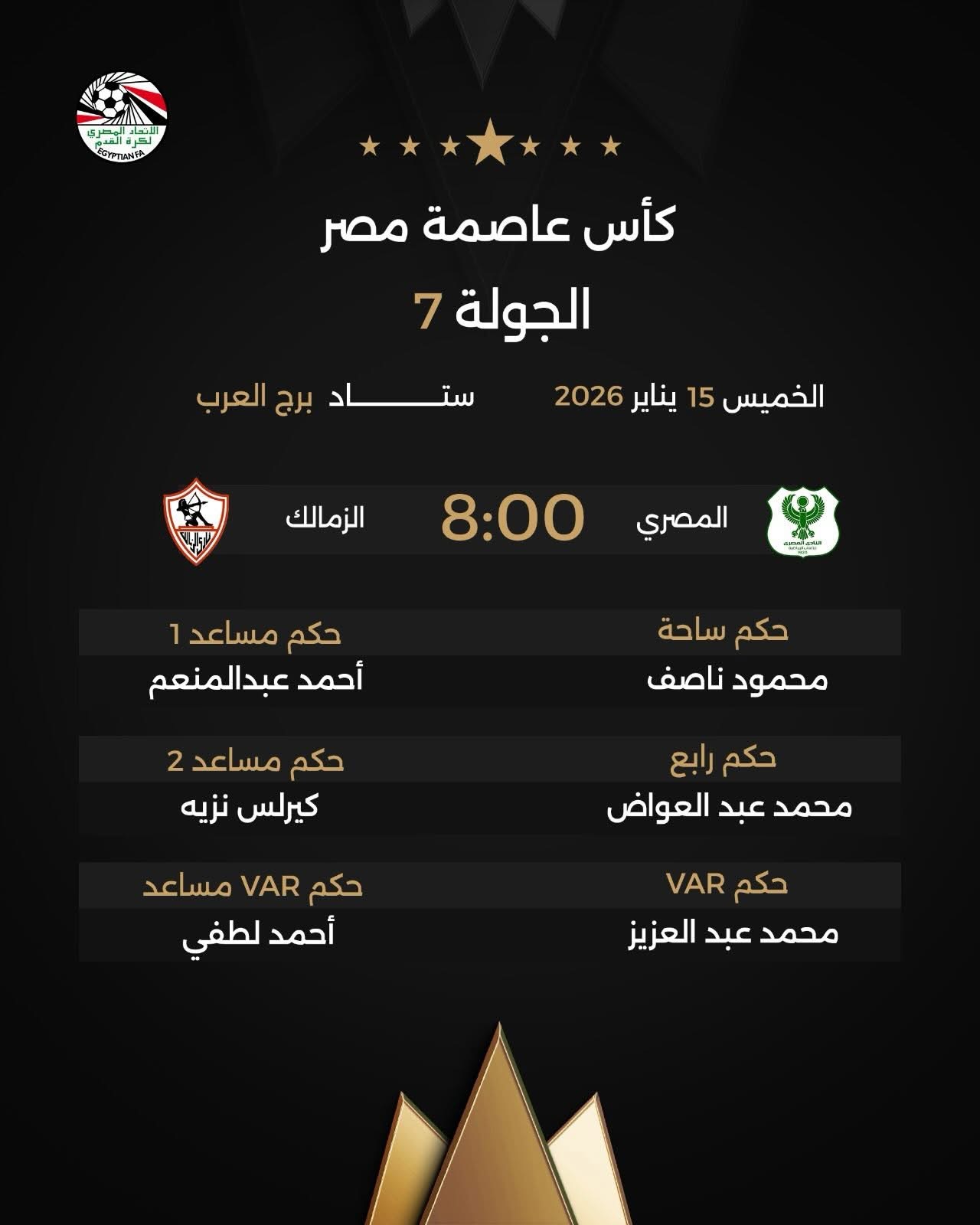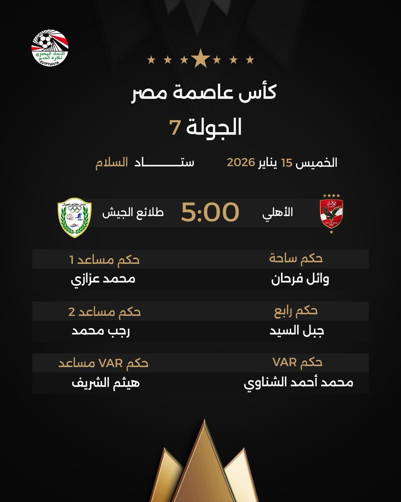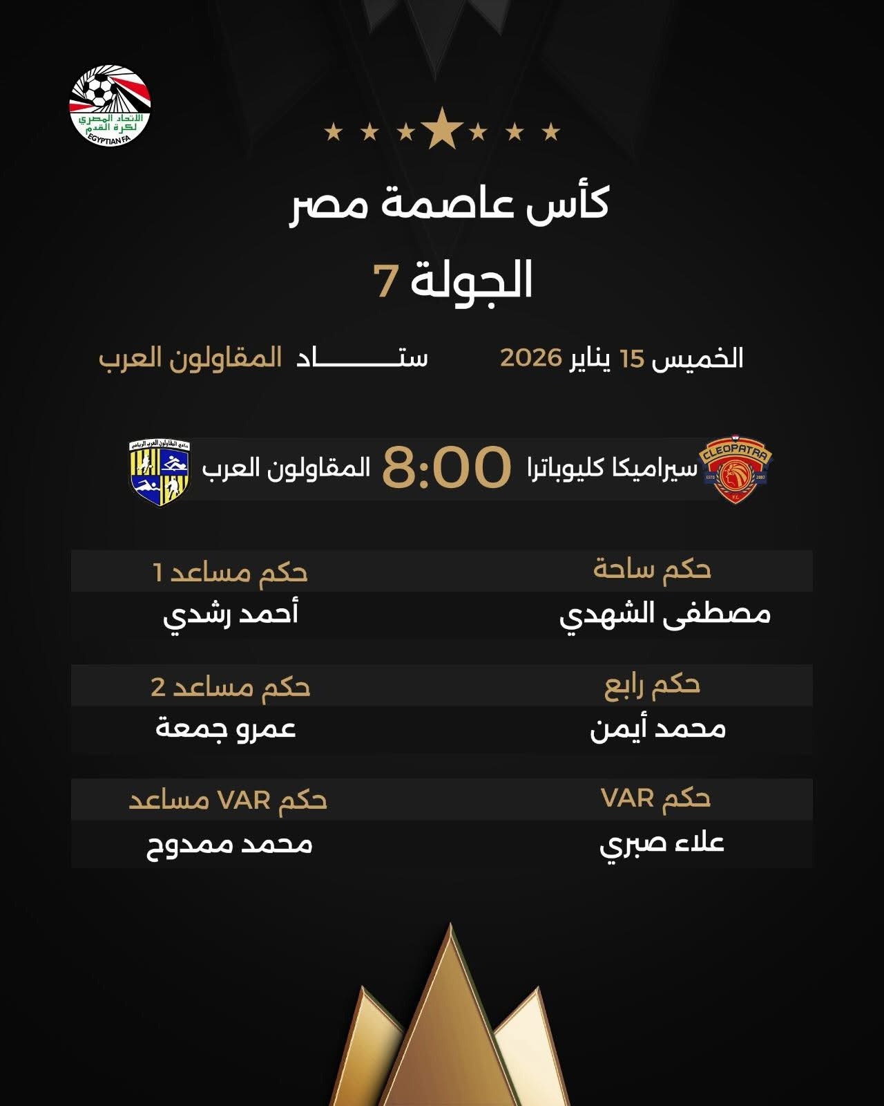 أعلنت لجنة الحكام الرئيسية بالاتحاد المصري لكرة القدم عن طاقم التحكيم المُكلف بإدارة مباريات بعد غد الخميس، ضمن منافسات الجولة السابعة من بطولة كأس عاصمة مصر.