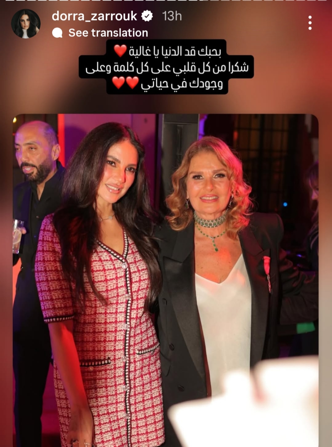 ونشرت درة صورة برفقة يسرا و علقت كاتبة: “بحبك قد الدنيا يا غالية، شكرا من كل قلبي على كل كلمة وعلى وجودك في حياتي”.