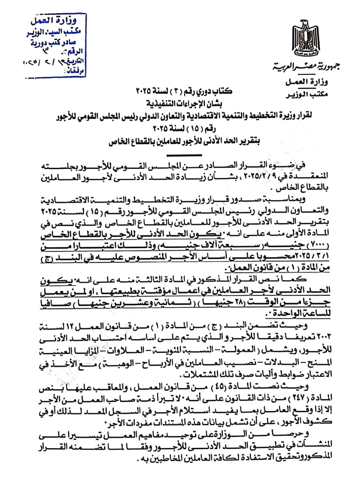 وأكد وزير العمل، أن هذا القرار يمثل خطوة مهمة ضمن منظومة القرارات التنفيذية لقانون العمل الجديد، ويهدف إلى حماية حقوق العمال وضمان بيئة عمل عادلة ومنظمة في القطاع الخاص، مع تحقيق التوازن بين مصالح أصحاب العمل والعاملين على حد سواء.