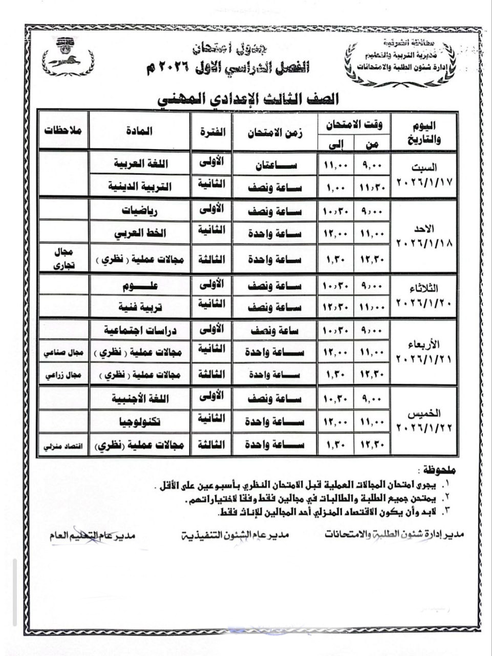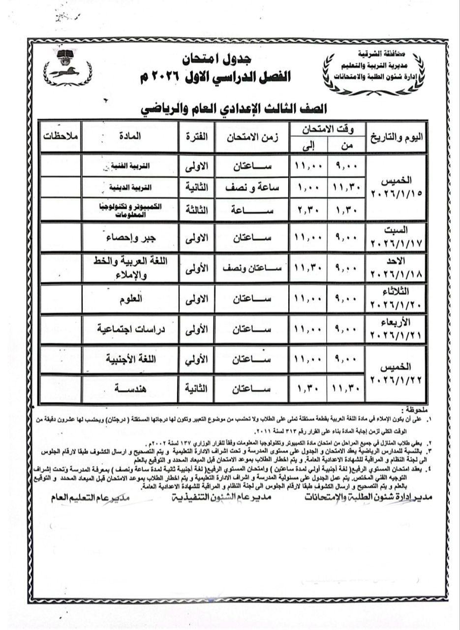 اعتمد المهندس حازم الأشموني محافظ الشرقية جدول امتحانات الفصل الدراسي الأول للمرحلة الإعدادية للعام الدراسي ٢٠٢٥ / ٢٠٢٦ بجميع الإدارات التعليمية بنطاق المحافظة، والتي من المقرر أن تنطلق يوم الخميس الموافق ١٥ يناير وتستمر حتى يوم الخميس الموافق ٢٢ يناير ٢٠٢٦.