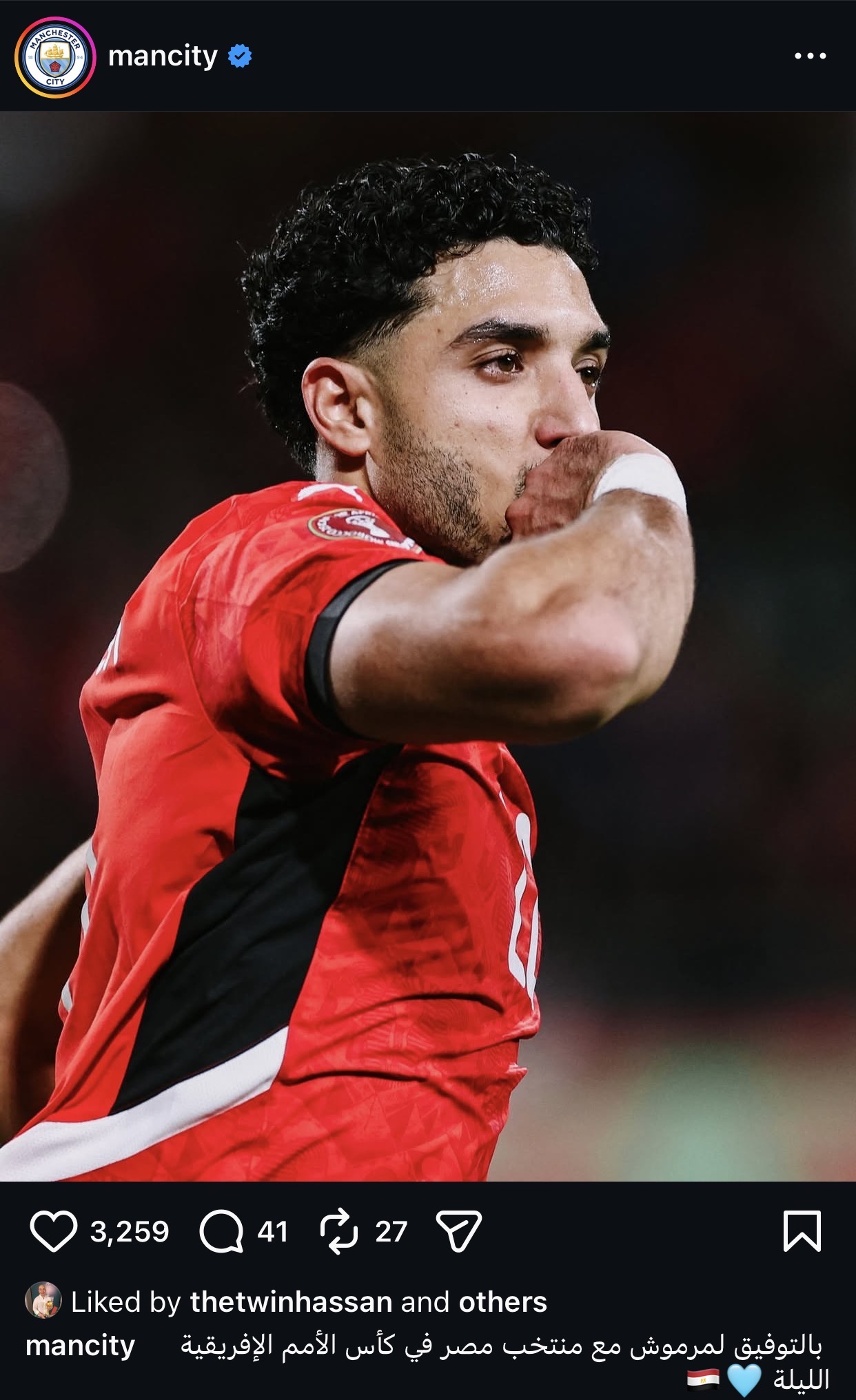 نشر نادي مانشستر سيتي الإنجليزي صورة للاعبه المصري عمر مرموش عبر حساباته الرسمية على مواقع التواصل الاجتماعي، وعلّق عليها برسالة دعم قبل مباراة السنغال المقرر إقامتها في السابعة مساء اليوم بمدينة طنجة، ضمن منافسات الدور نصف النهائي لبطولة المقامة حاليًا في المغرب.