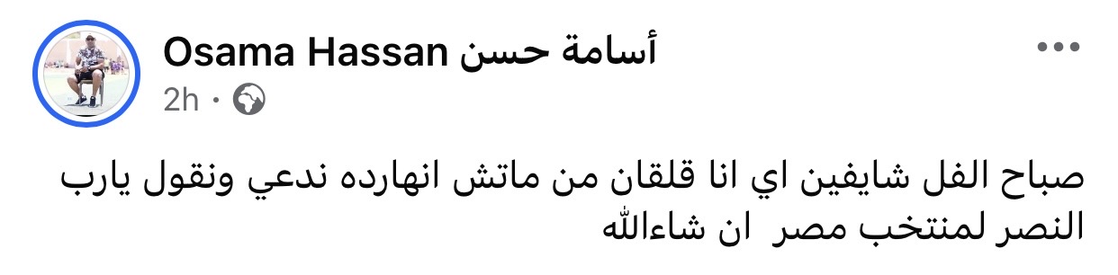 وكتب أسامة حسن على حسابه الشخصي بموقع فيسبوك: "صباح الفل شايفين ايه.. أنا قلقان من ماتش انهاردة ندعي ونقول يارب النصر لمنتخب مصر إن شاءالله".