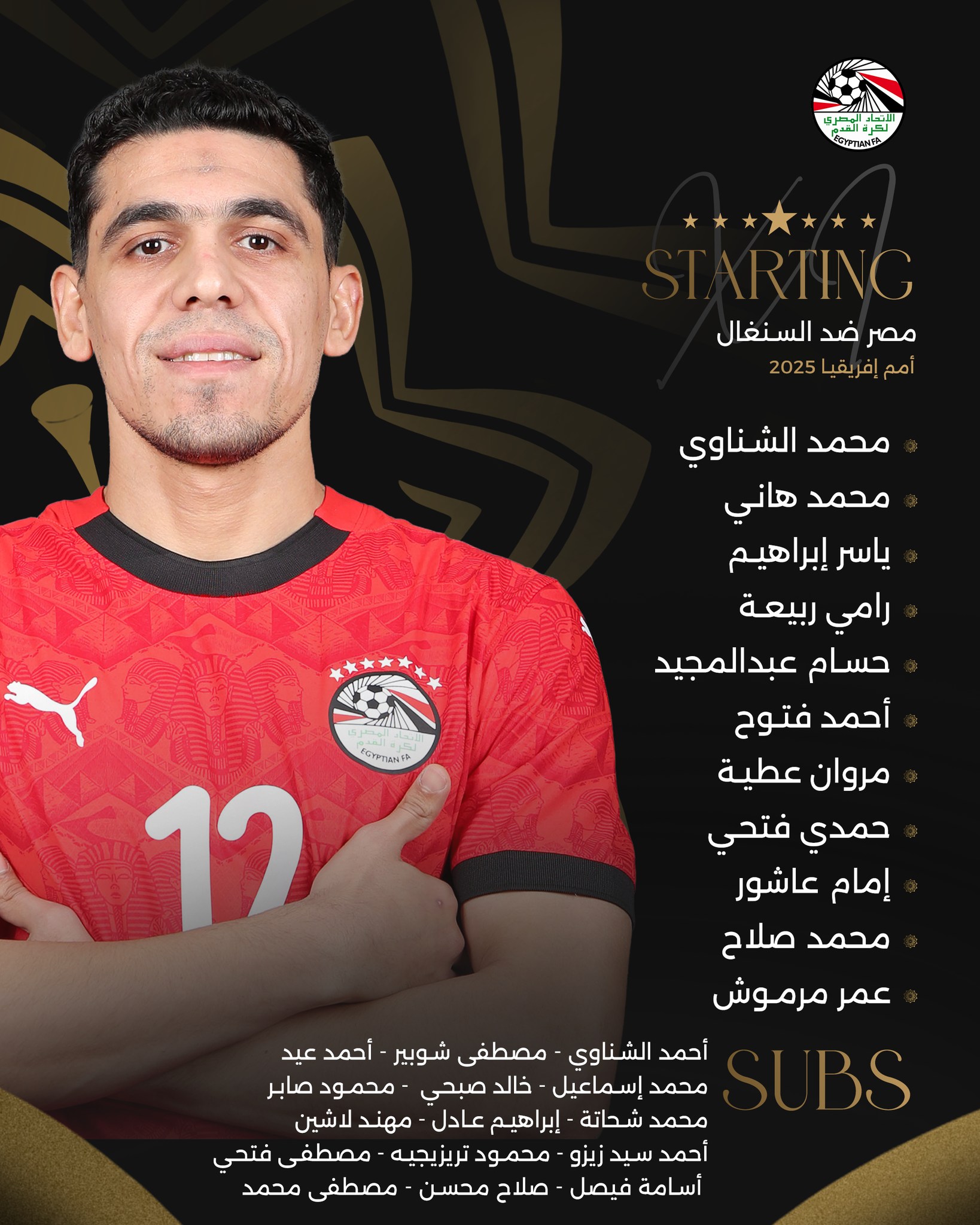أعلن حسام حسن المدير الفني لمنتخب مصر الوطني تشكيل الفراعنة الكبار لمواجهة السنغال فى نصف نهائي كأس أمم أفريقيا 2025 بالمغرب.