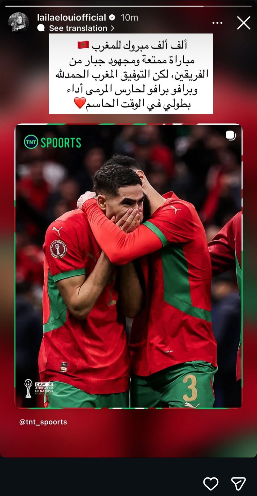 هنأت الفنانة ليلى علوي، منتخب المغرب بعد التأهل لنهائي بطولة كأس الأمم الأفريقية على حساب نيجيريا.