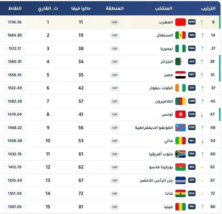 وضمت قائمة العشرة الأوائل إفريقيًا أيضًا منتخبات كوت ديفوار، والكاميرون، وتونس، والكونغو الديمقراطية، ومالي، وجنوب إفريقيا، في ظل تقارب كبير في النقاط بين عدد من المنتخبات، ما يعكس ارتفاع مستوى المنافسة داخل القارة.