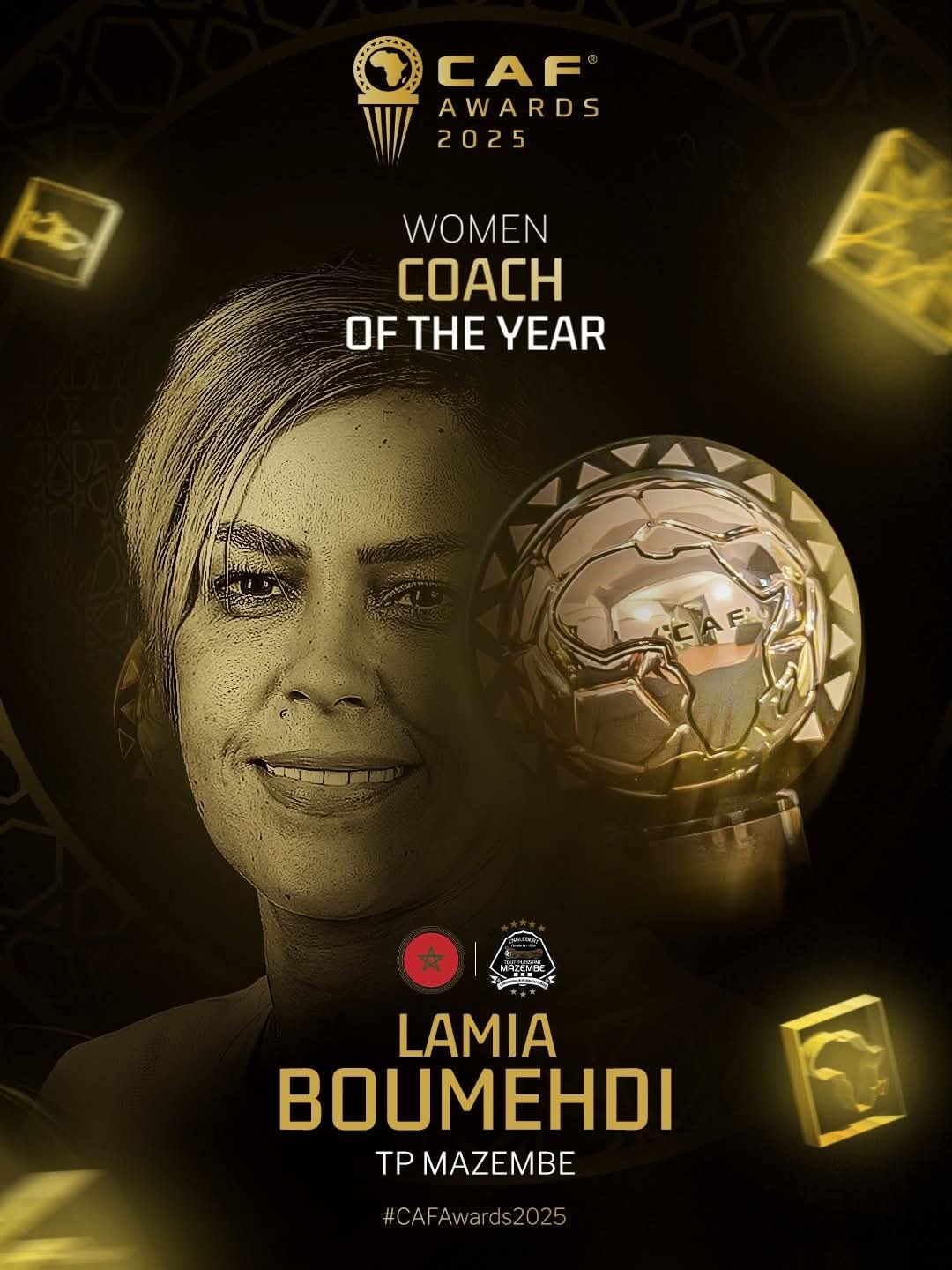 وفوز نادي الجيش الملكي المغربي بجائزة أفضل نادٍ للسيدات في القارة الأفريقية لعام 2025، وفوز المدربة المغربية " لمياء بومهدي مدربة نادي مازيمبي الكونغولي بجائزة أفضل مدربة في القارة الأفريقية لعام 2025.