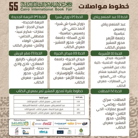 عن طريقة الوصول لمعرض الكتاب، فقد نشر في وقت سابق 7 خطوط للوصول إلى المعرض بكل سهولة وهي (خط عبدالمنعم رياض- خط دوران شبرا –خط النزهة الجديدة خط الأميرية – خط ميدان الجيزة – خط صقر قريش – خط المظلات)، فيما توجد بعض الخطوات العابرة لمحور المشيرة تمر بمعرض الكتاب، والتي جاءت كالتالي: