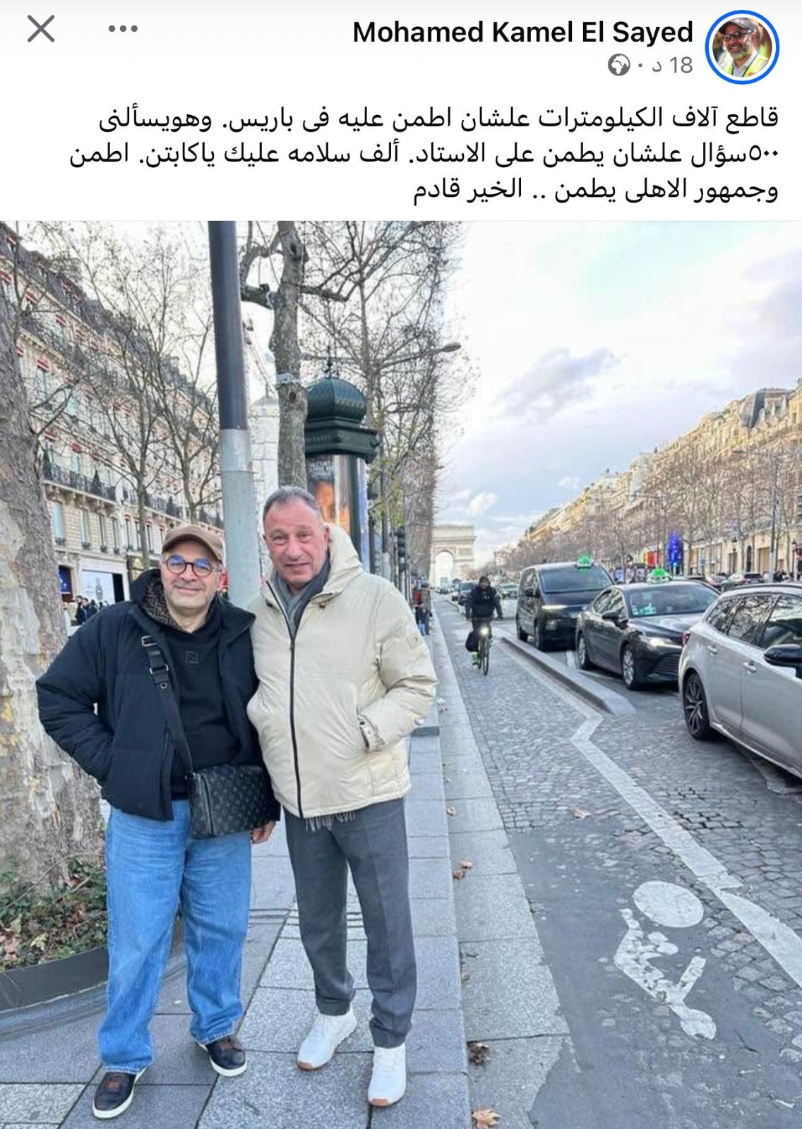 وقال كامل في منشور له على حسابه الشخصي بموقع فيسبوك: “500 سؤال علشان يطمن على الاستاد، قاطع آلاف الكيلومترات علشان أطمن عليه فى باريس .. وهو يسألنى 500 سؤال علشان يطمن على الاستاد .. ألف سلامة عليك ياكابتن أطمن وجمهور الأهلى يطمن .. الخير قادم”.
