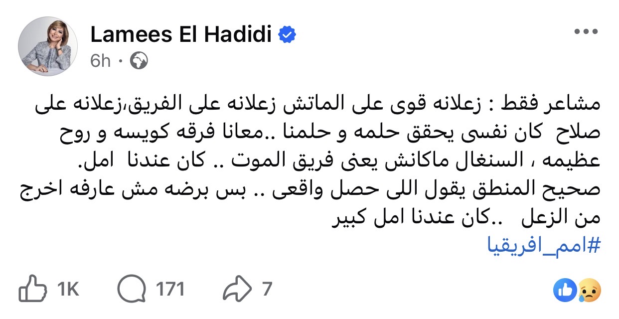 وتابعت: “السنغال ماكانش يعنى فريق الموت .. كان عندنا امل”.