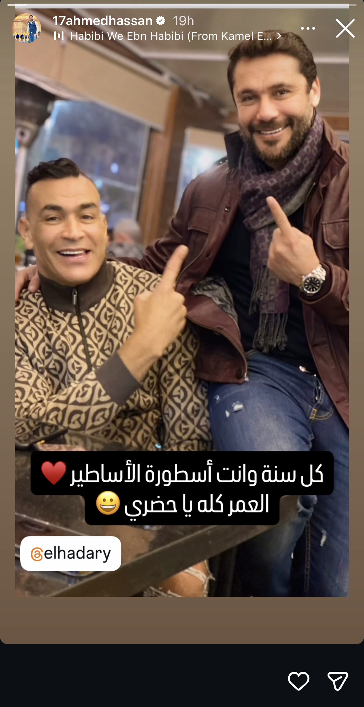 وكتب أحمد حسن عبر ستوري حسابه على انستجرام: “كل سنة وانت أسطورة الأساطير العمر كله يا حضري”.