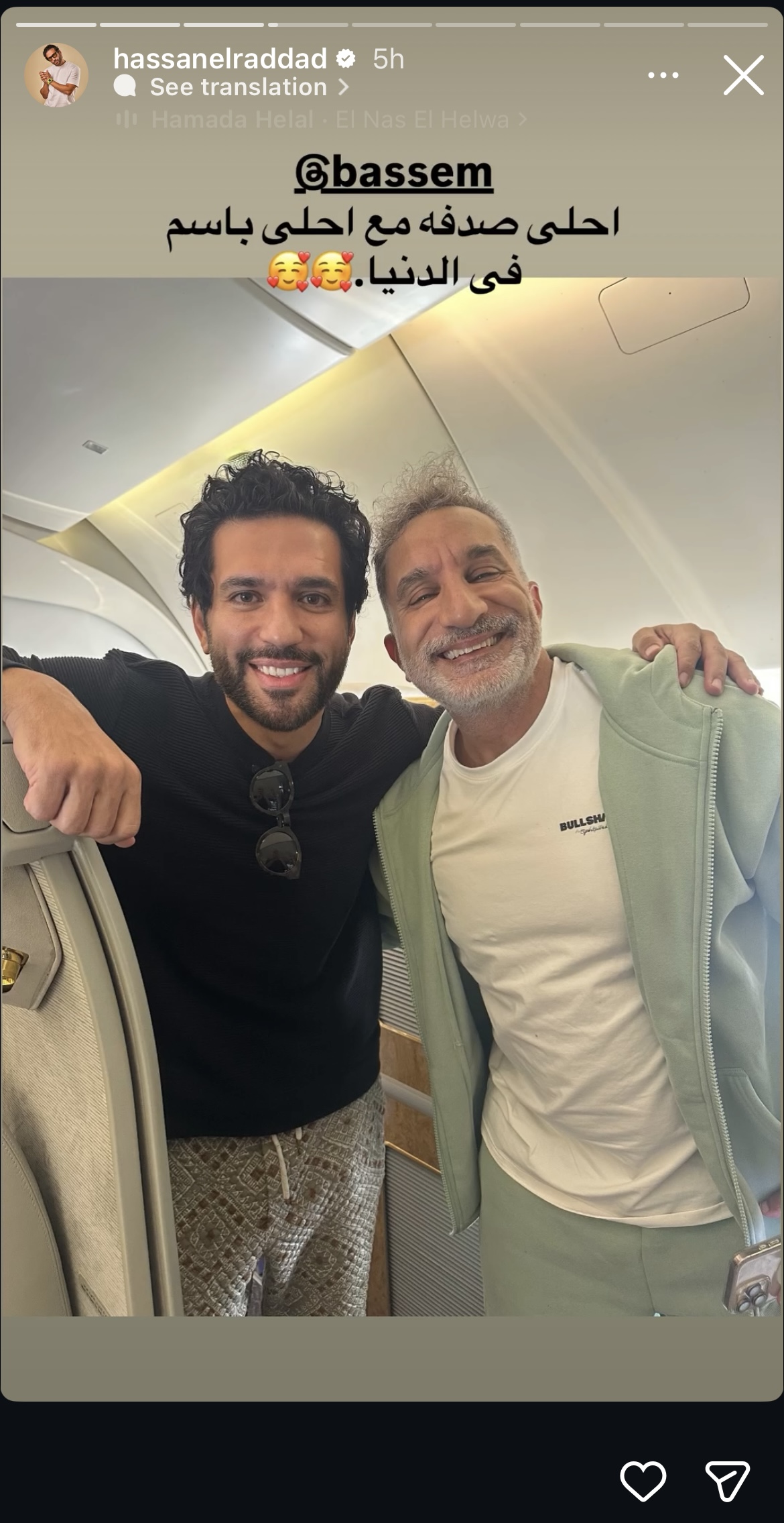 وظهر الرداد رفقة باسم يوسف، من الطائرة وعلق: “أحلى صدفة مع أحلى باسم في الدنيا”.