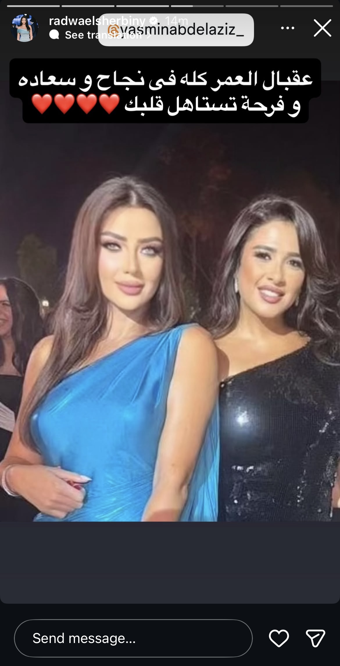 هنأت الإعلامية رضوى الشربيني، الفنانة ياسمين عبد العزيز، بمناسبة عيد ميلادها.