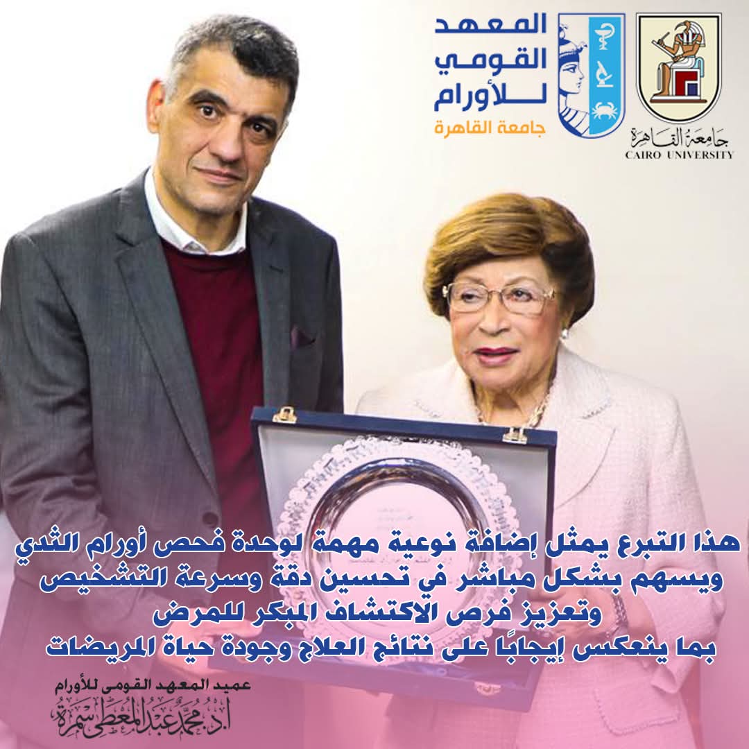جاء ذلك بحضور محمد عبد العاطي عميد المعهد القومى للأورام والدكتورة نوال الدجوي رئيس مجلس ادارة جامعة اكتوبر للعلوم الحديثة والاداب، رئيس مجلس الامناء لمؤسسه بلدنا للتنميه والخدمات الاجتماعية الاهليه وقد قامت المؤسسة بالتبرع بكامل قيمة الجهاز للمعهد القومي للأورام مما سيكون له اكبر الأثر في رفع مستوي الرعاية الصحية المقدمة للمريضات المصابات بسرطان الثدي.، ووكلاء المعهد، وإدارة المستشفيات، إلى جانب عدد من القيادات الطبية، حيث تم تشغيل الجهاز داخل المستشفى الجنوبى الحاصل على اعتماد الهيئة العامة للاعتماد والرقابة الصحية (GAHAR)، والمعتمد دوليًا من منظمة ISQua، فى خطوة تعكس التزام المعهد بتطبيق أعلى معايير الجودة العالمية.