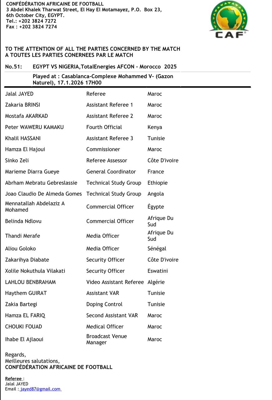 أعلنت لجنة الحكام الرئيسية بالاتحاد الإفريقي لكرة القدم عن طاقم تحكيم مباراة منتخب مصر ومنتخب نيجيريا، على أرضية إستاد مركب محمد الخامس، المستضيف للمباراة المقرر لها السادسة مساء غد بتوقيت القاهرة في مباراة تحديد المركز الثالث، لبطولة كأس الأمم الأفريقية ٢٠٢٥ المقامة بالمغرب.
