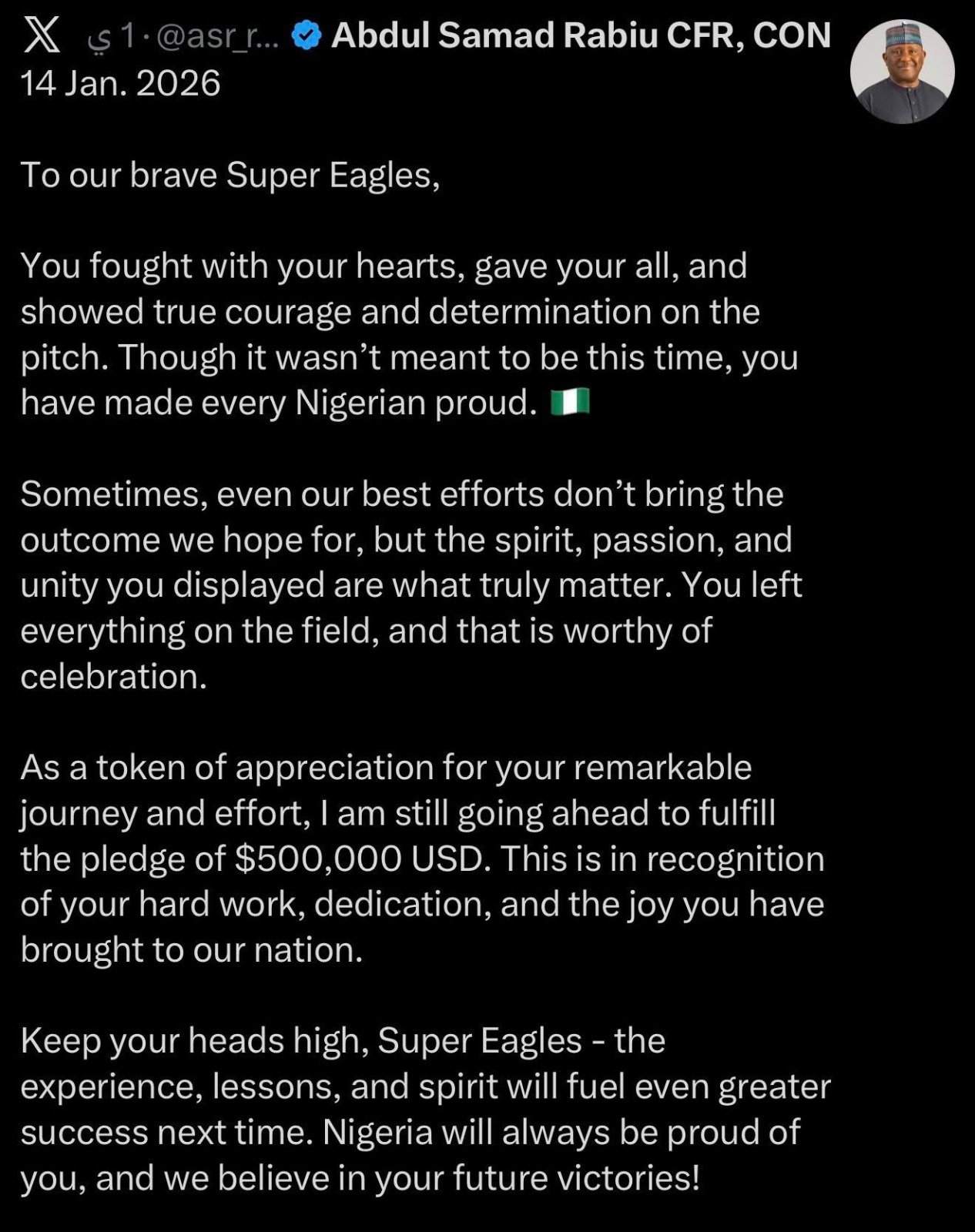 وأعلن رابيو: "تقديرا لمسيرتكم الرائعة وجهودكم الجبارة، سأستمر في الوفاء بالوعد بمنح 500 ألف دولار أمريكي، اعترافًا بعملكم الجاد وتفانيكم والفرحة التي جلبتموها لأمتنا.. ابقوا مرفوعي الرأس، يا نسورنا الخضراء – هذه التجربة والدروس والروح ستدفعكم نحو نجاحات أكبر في المرات القادمة. نيجيريا دائمًا فخورة بكم، ونحن نؤمن بانتصاراتكم المستقبلية".