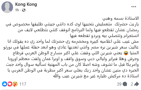 وواصل شقيق شيرين عبد الوهاب، منشوره: «يعني شيرين اللي وقفت على أكبر مسارح الوطن العربي، قرطاج، وجرش، وهلا فبراير، وليالي دبي، وسوق واقف، وأوبرا عمان، ولفِّت معظم أوروبا وأمريكا قبل ما تشوف وشه أصلا، كان من باب المهنية تسأليه سؤال واحد: جبت الخِبرَة دي منين عشان واحد زيك يعلِّي سعر أكبر مطربة في الوطن العربي؟.. يا أستاذة ده مركبش طيارة غير مع شيرين.. عيب والله».