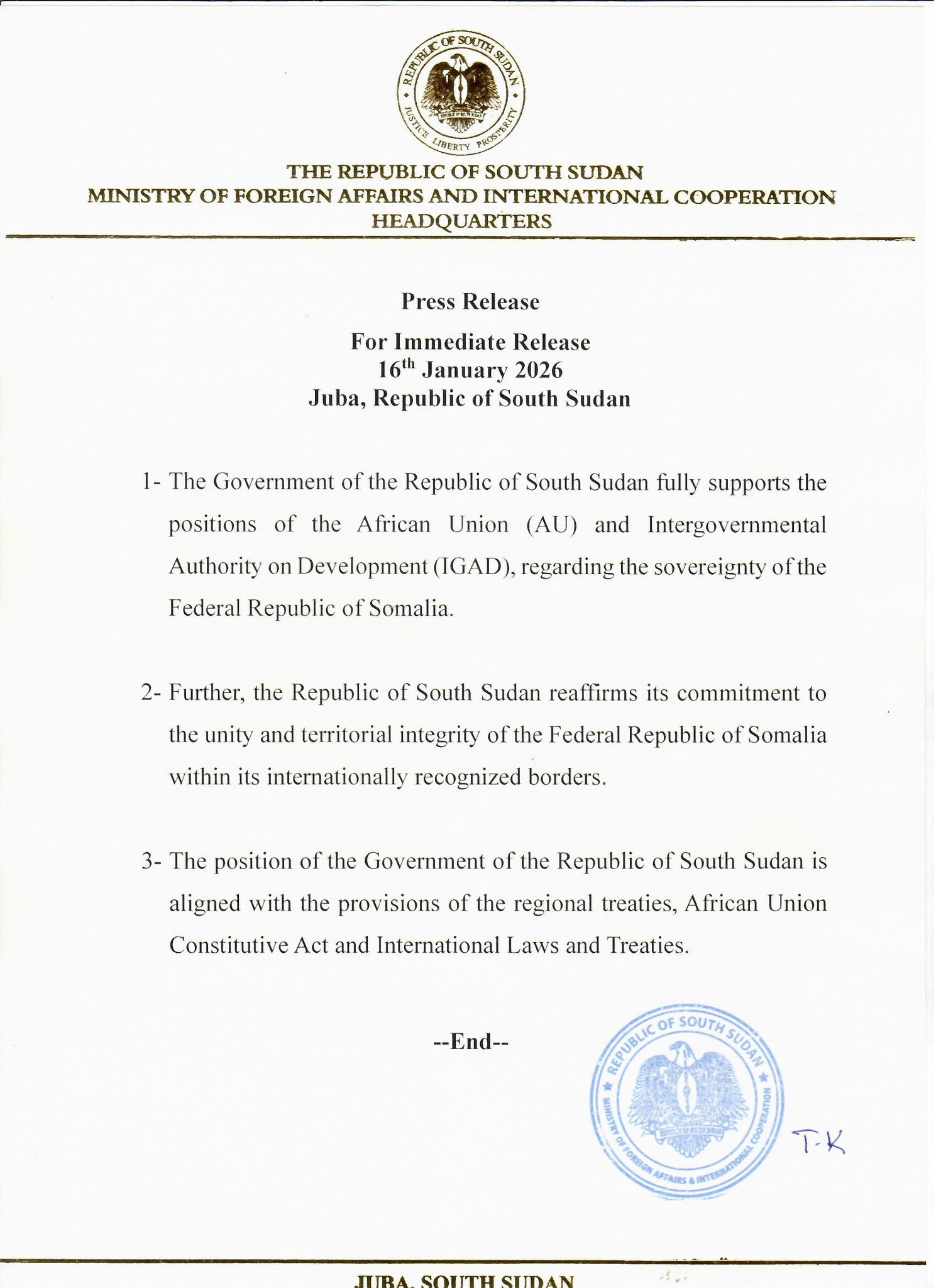 وأكدت جنوب السودان بحسب البيان، مجددًا التزامها بوحدة جمهورية الصومال الفيدرالية وسلامة أراضيها ضمن حدودها المعترف بها دوليًا.