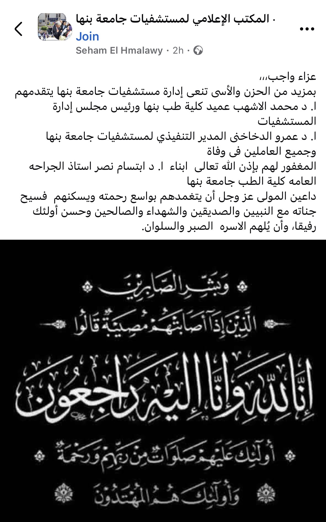 وتقدم بخالص العزاء كل من الأستاذ الدكتور محمد الأشهب، عميد كلية طب بنها ورئيس مجلس إدارة المستشفيات، والأستاذ الدكتور عمرو الدخاخني، المدير التنفيذي لمستشفيات جامعة بنها، وجميع العاملين بالمستشفيات، داعين الله عز وجل أن يتغمدهم بواسع رحمته، ويسكنهم فسيح جناته، مع النبيين والصديقين والشهداء والصالحين، وحسن أولئك رفيقًا.