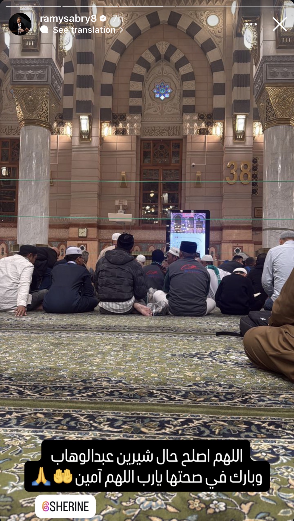 حيث نشر رامي صبري صورة من داخل المسجد عبر حسابه الشخصي بموقع إنستجرام داعيًا لـ شيرين قائلًا: “اللهم اصلح حال شيرين عبدالوهاب وبارك في صحتها يارب اللهم آمين ”.