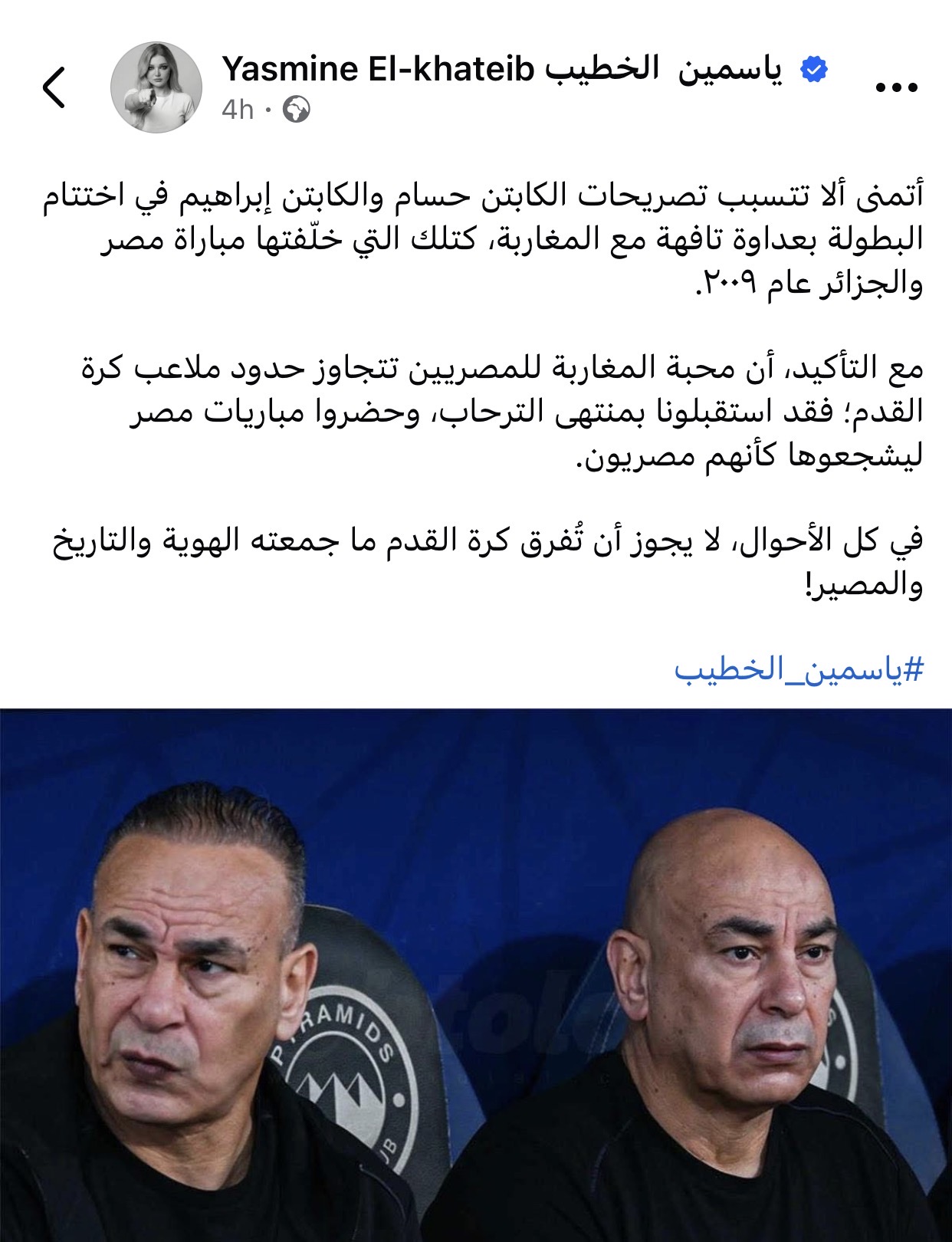 وكتبت ياسمين الخطيب على حسابها الشخصي بموقع فيسبوك: “أتمنى ألا تتسبب تصريحات الكابتن حسام والكابتن إبراهيم في اختتام البطولة بعداوة تافهة مع المغاربة، كتلك التي خلّفتها مباراة مصر والجزائر عام ٢٠٠٩”.