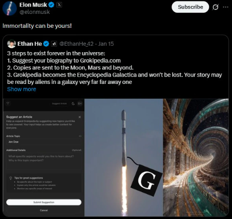 وفقا لما نشر على منصته إكس X، يمكن لأي شخص اقتراح سيرته الذاتية على "جروكيبيديا" Grokipedia، ومن ثم إرسال نسخ منها إلى الفضاء، سواء على القمر أو المريخ أو أبعد من ذلك، ضمن رؤية إيلون ماسك لما أسماه “الموسوعة المجرة”، الفكرة هي أن تصل هذه المعلومات إلى حضارات فضائية في المستقبل، حتى بعد مرور قرون أو آلاف السنين على رحيل الشخص.