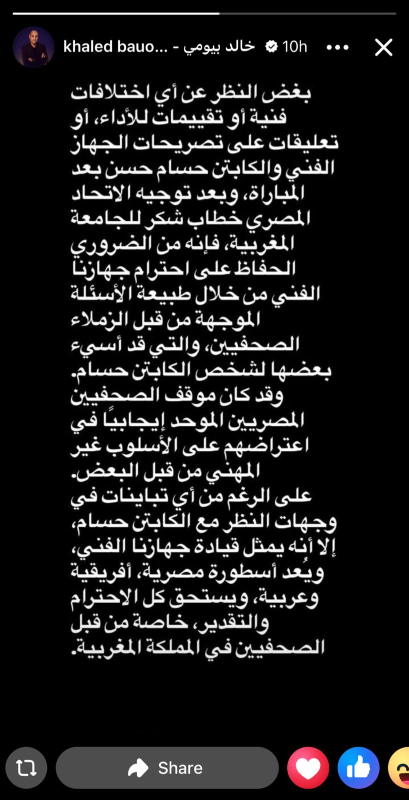 وكتب خالد بيومي، عبر حسابه على فيسبوك: “بغض النظر عن أي اختلافات فنية أو تقييمات للأداء أو تعليقات على تصريحات الجهاز الفني والكابتن حسام حسن بعد المباراة، وتوجيه الاتحاد المصري خطاب للجامعة المغربية، فإنه من الضروري الحفاظ على احترام جهازنا الفني من خلال طبيعة الاسئلة الموجهه من قبل الزملاء الصحفيين والتي قد اساء بعضها لشخص الكابتن حسام حسن".