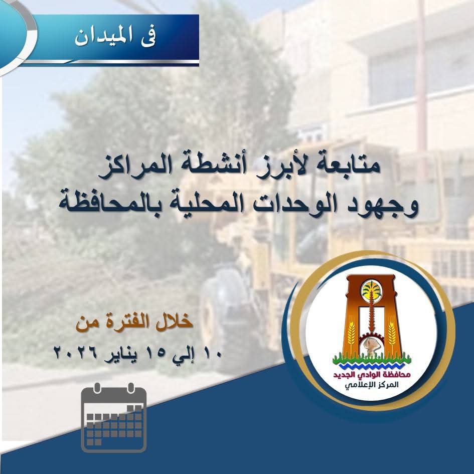 أعلنت محافظ الوادي الجديد عن أبرز جهود الوحدات المحلية بالمراكز في رفع كفاءة المرافق وتحسين مستوى الخدمات المقدمة للمواطنين؛ خلال الفترة من ١٠ إلى ١٥ يناير ٢٠٢٦م.