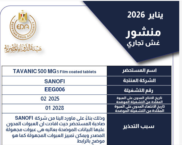 ووجهت هيئة الدواء، في منشورها الذي حمل رقم “7” لعام 2026، من سحب تشغيلة رقم «EEG006» من عقار TAVANIC 500 MG5 Film coated tablets.