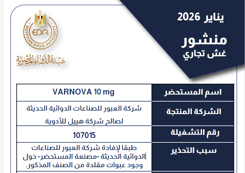 ووجهت هيئة الدواء، في منشورها الذي حمل رقم “4” لعام 2026، من سحب تشغيلة رقم «107015» من عقار VARNOVA 10 mg