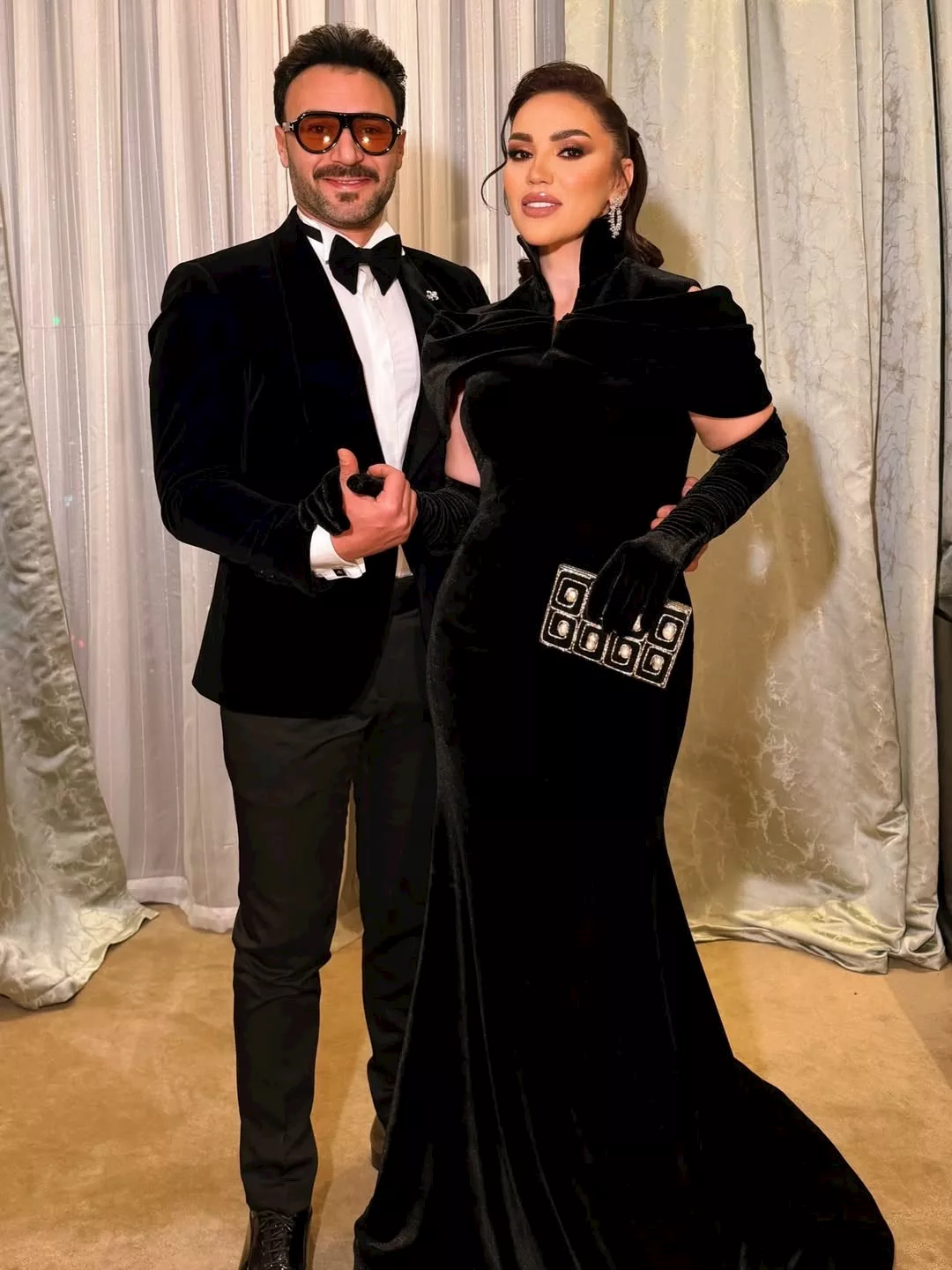 وظهرت مي فاروق وزوجها عمرو العمروسي بملابس متشابهة ومتناغمة مع بعضهما، إذ ارتدى كل منهما إطلالة باللون الأسود.