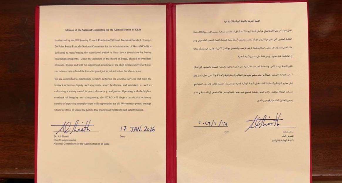 أعلن رئيس اللجنة الوطنية الفلسطينية لإدارة غزة، الدكتور علي شعث، بدء عمل اللجنة رسميًا عبر توقيعه أول قراراته الرسمية.