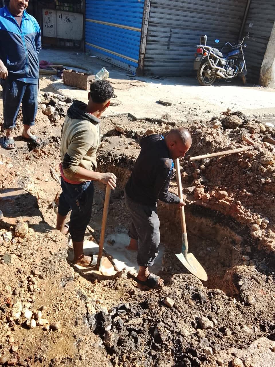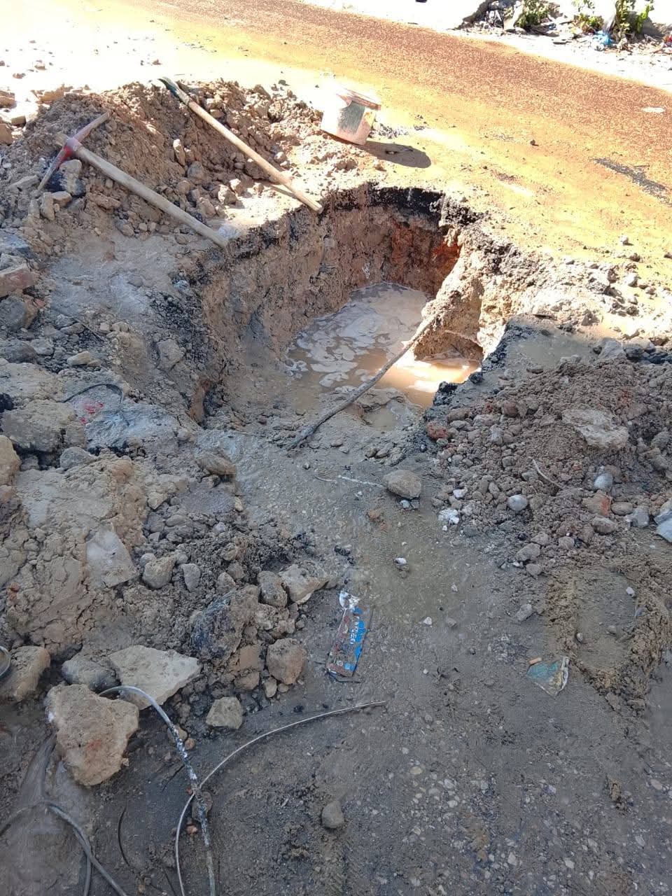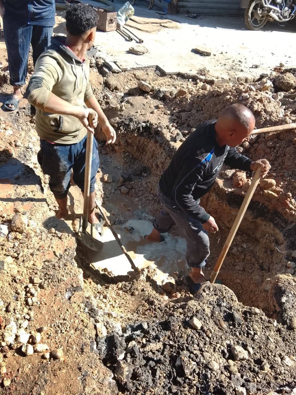 تابع فوزى الوالى رئيس حى الضواحي بمحافظة بورسعيد البدء فى إصلاح كسر ماسورة مياه عذبة خلف عمارة رقم ٤٧ بمنطقة بنك الاسكان.