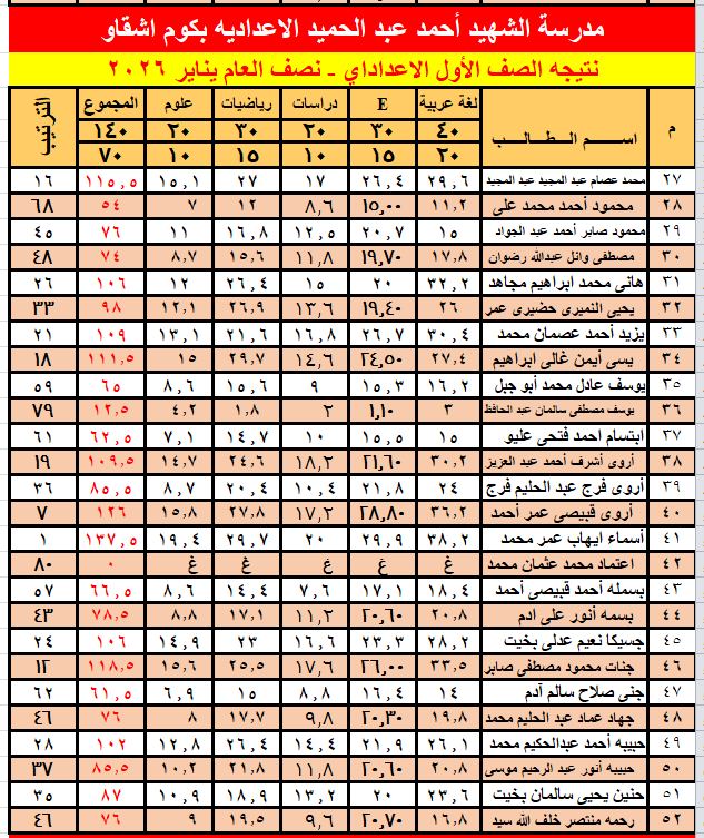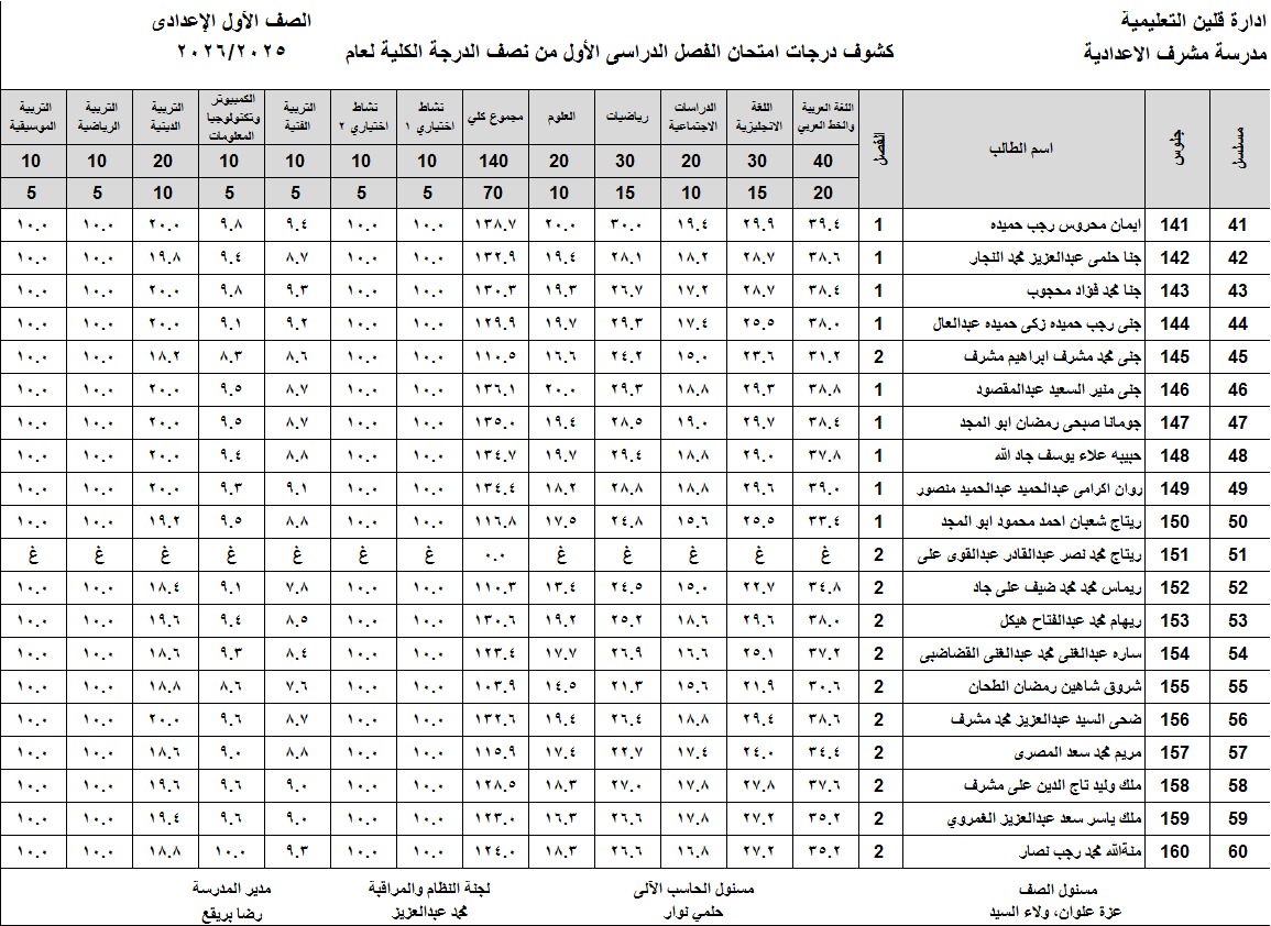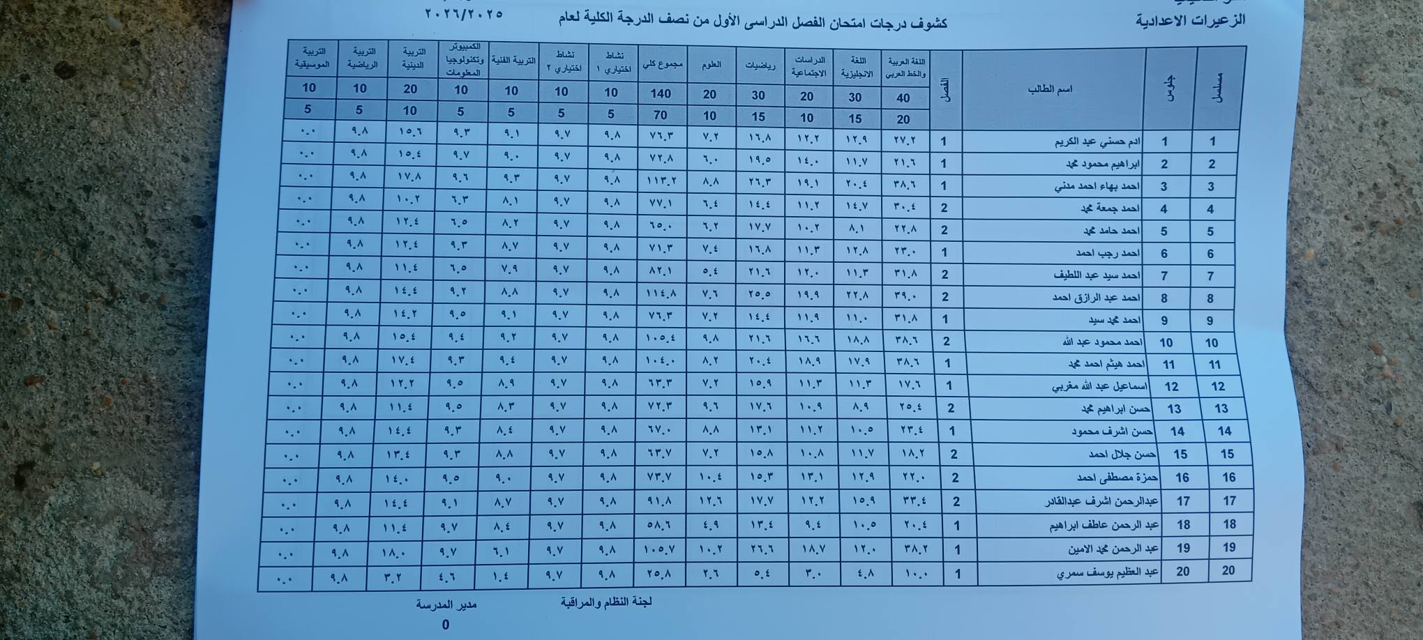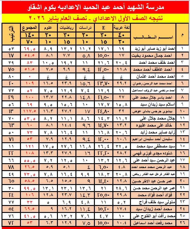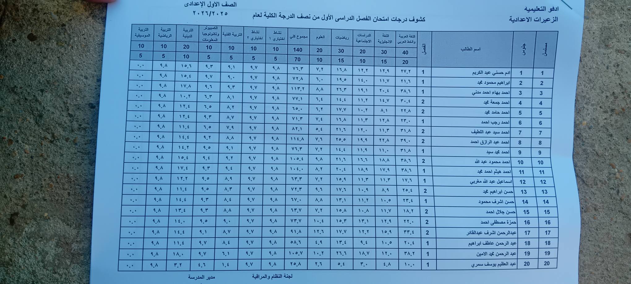 وقامت الصفحات الرسمية للمدارس على فيس بوك ، بإعلان ظهور نتيجة الصف الأول الإعدادي برقم الجلوس والاسم 2026 في شكل قوائم كاملة بالدرجات في جميع المواد