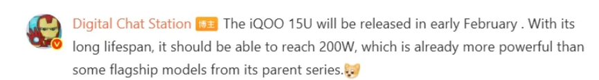 انتشرت مؤخرًا تقارير تفيد بظهور هاتف iQOO 15 Ultra مزودًا بشاحن بقوة 100 واط على منصة شهادات 3C الصينية وقد أكدت منشورات عديدة من شركة DCS على موقع ويبو أن الهاتف سيدعم الشحن السلكي بقوة 100 واط، إلا أن منشورًا جديدًا على ويبو يشير إلى أنه قد يوفر ضعف سرعة الشحن.