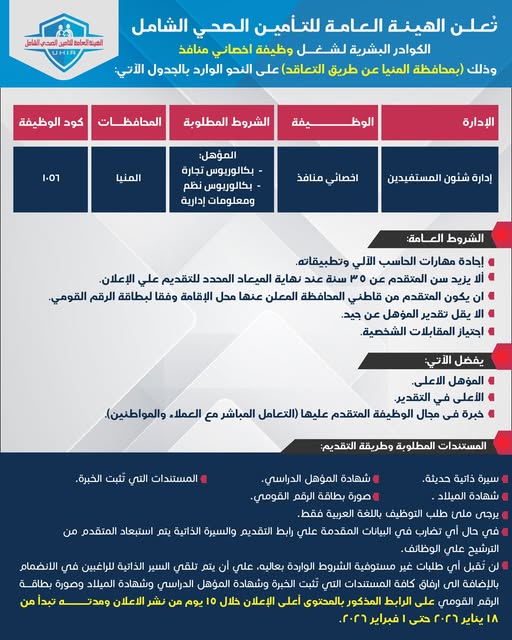أعلنت الهيـئــة الـعـامــة للتــأميــن الـصحـي الشامـل عــن حـاجـتــهـا لعدد من الكوادر البشرية لـشـــغــــل وظيفة اخصائي منافذ، وذلك بمحافظة المنيا عن طريق التعاقد على النحو الوارد بالإعلان أدناه.