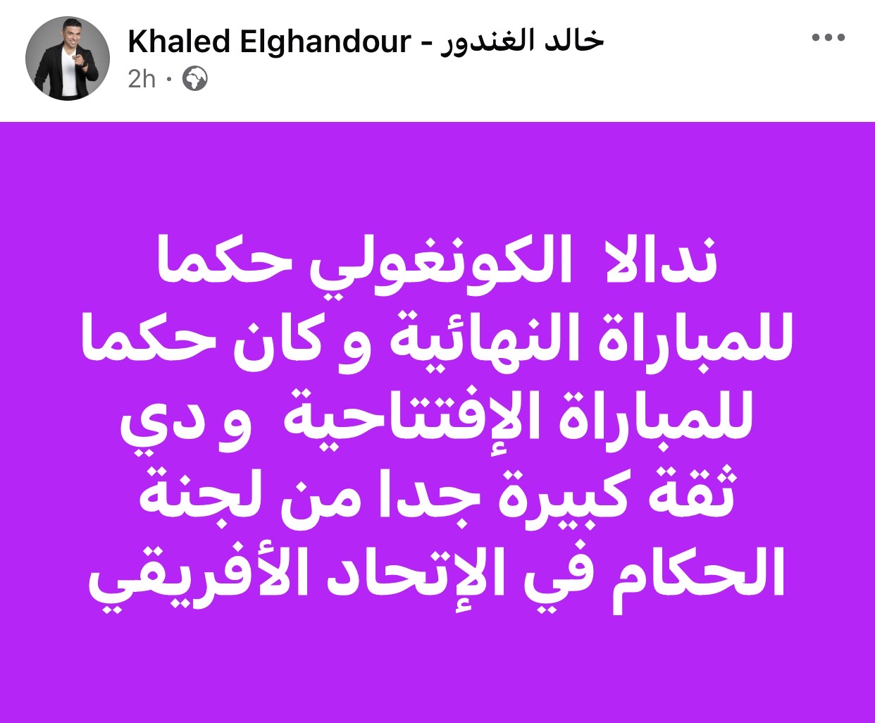 وكتب الغندور عبر حسابه الشخصي بموقع فيسبوك: “ندالا الكونغولي حكما للمباراة النهائية و كان حكما للمباراة الإفتتاحية و دي ثقة كبيرة جدا من لجنة الحكام في الإتحاد الأفريقي”.