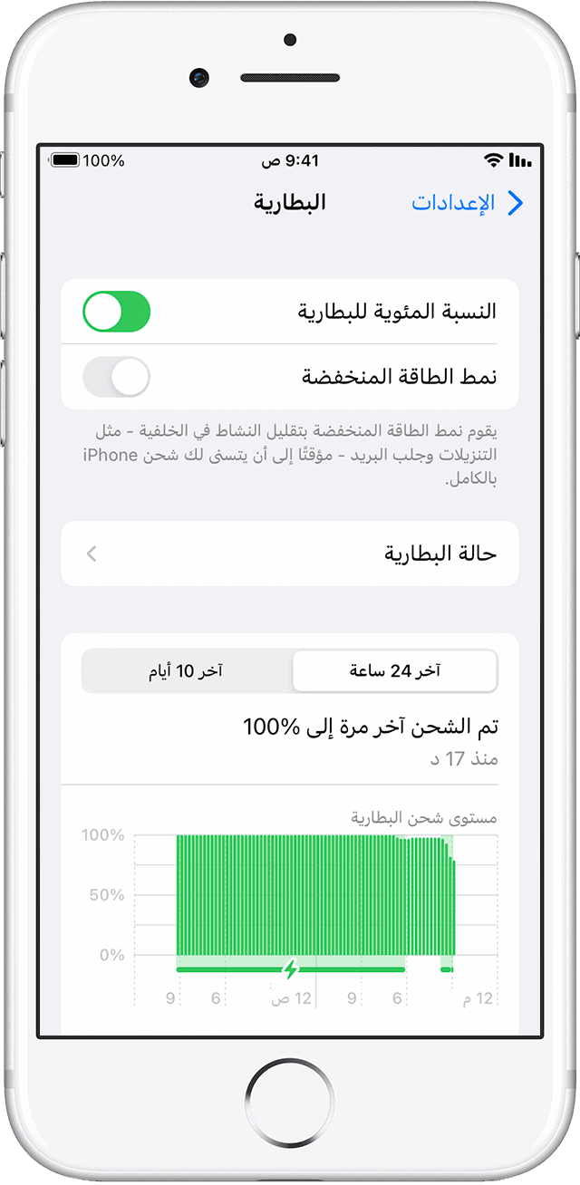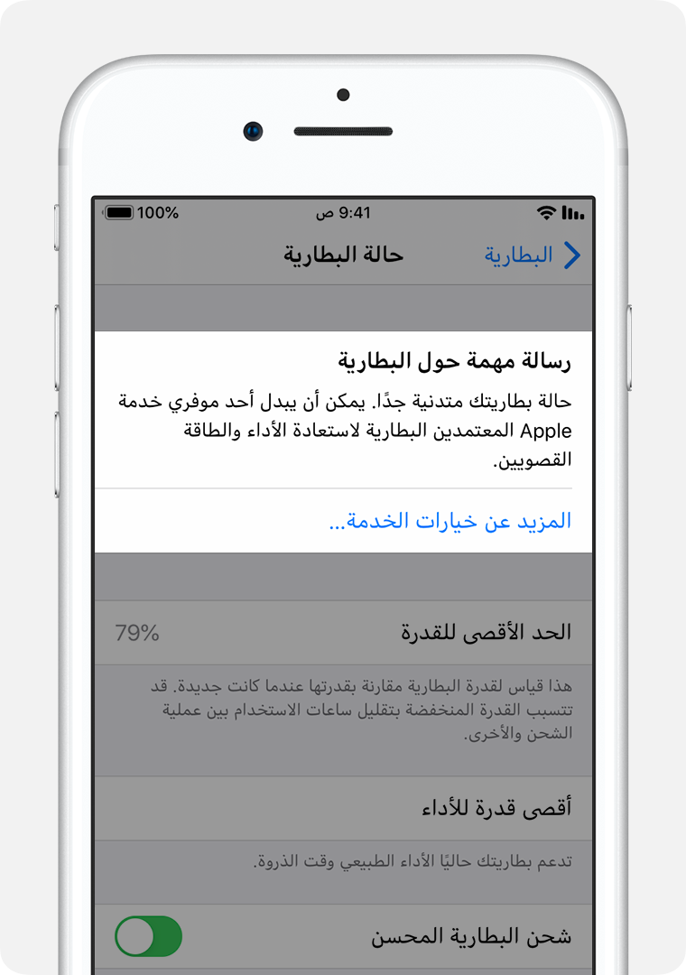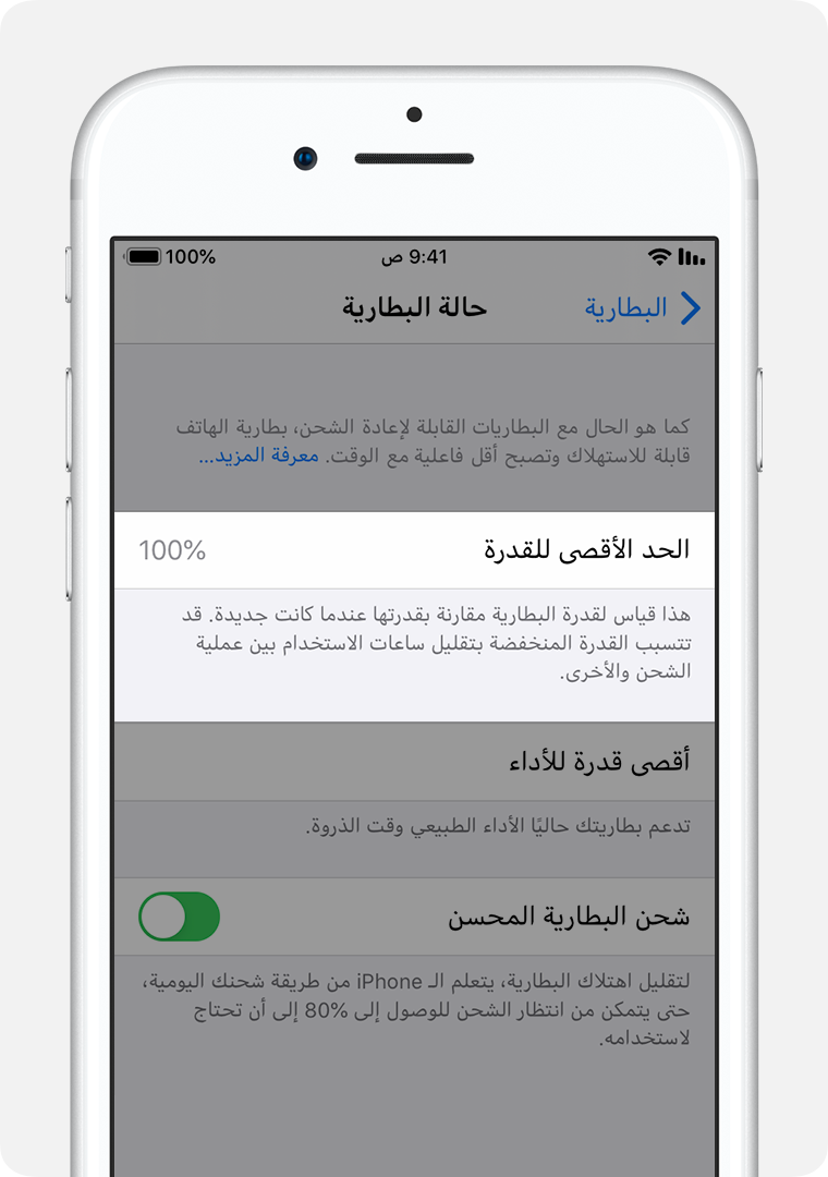 وبحسب الفترة الزمنية بين تصنيع هاتف iPhone وتنشيطه، قد تظهر السعة القصوى بنسبة تقل قليلا عن 100 بالمائة.
