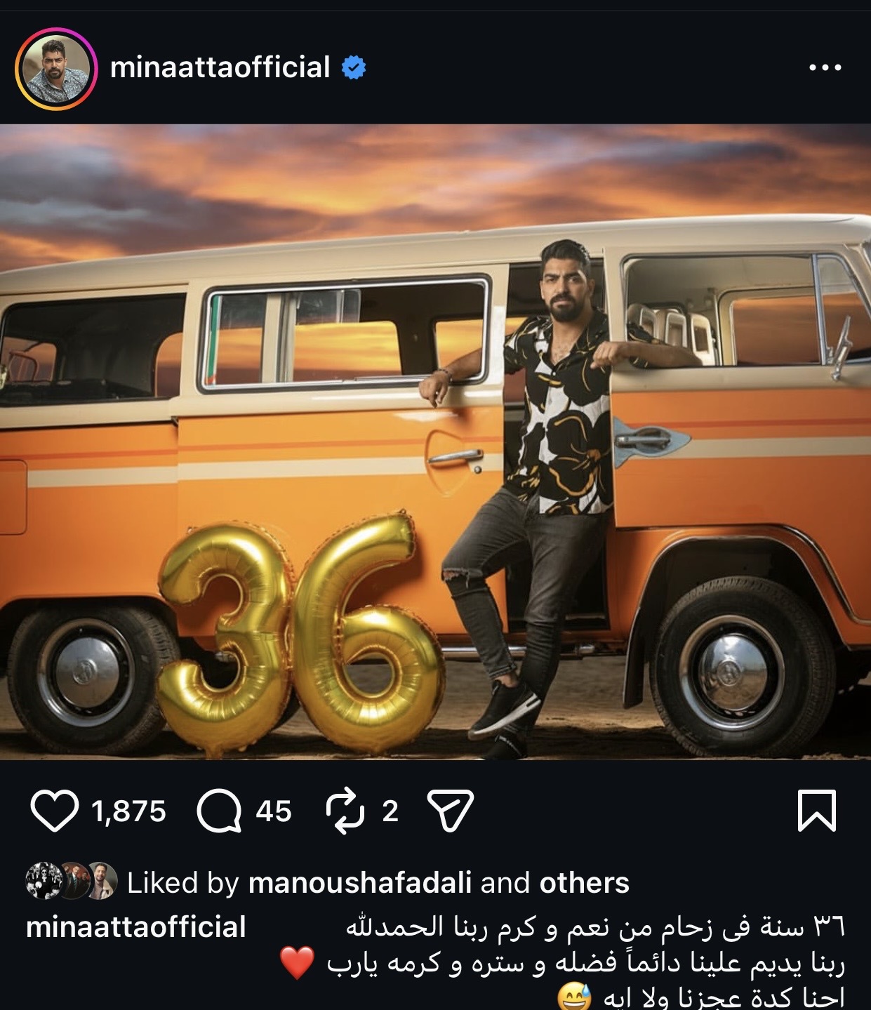 نشر الفنان مينا عطا صورة له عبر حسابه الشخصي بموقع إنستجرام بمناسبة عيد ميلاده الـ ٣٦ .
